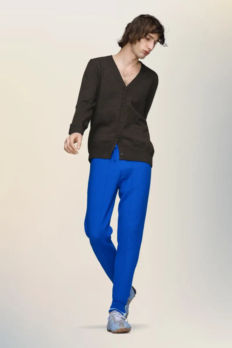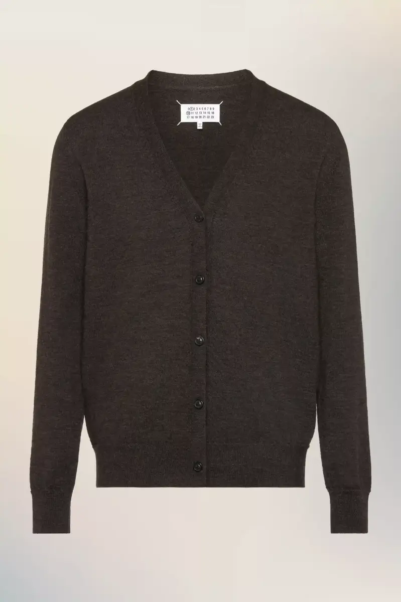 The cardigan is crafted from wool and features long-sleeves, a V-neck design and ribbed trims. With tonal button fastenings, to be worn open or closed, it forms part of a wider collection of lightweight classic gentlemen’s woolen knits. The cardigan is adorned with the Maison’s elbow patches with a slightly lived-in effect. Maison Margiela’s signature, the four stitches, appear at the back; the opposite of a label.