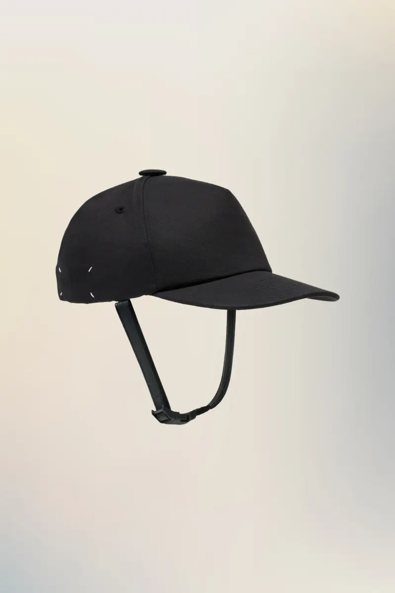 This cotton riding cap distills equestrian influences into a minimal silhouette. Its curved brim and tonal strap suggest quiet utility, in keeping with the collection’s reworking of countryside staples. Maison Margiela’s signature, the four stitches, appear to the side; the opposite of a label.
