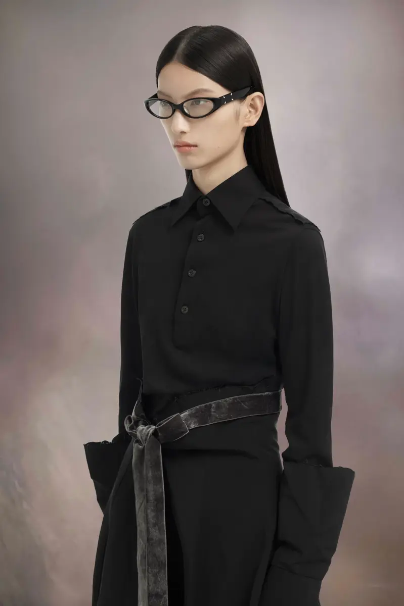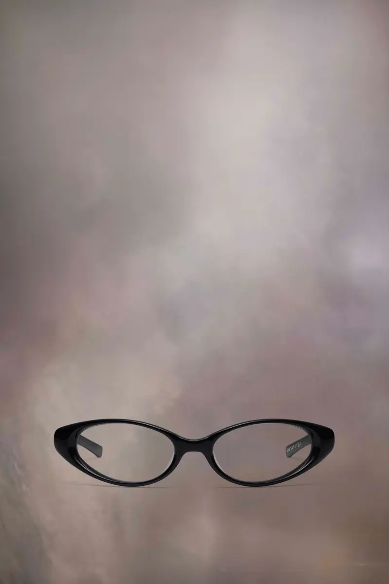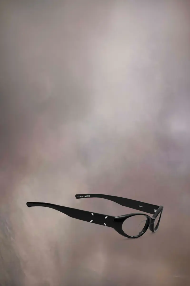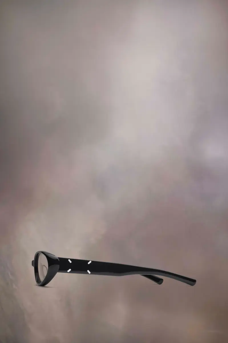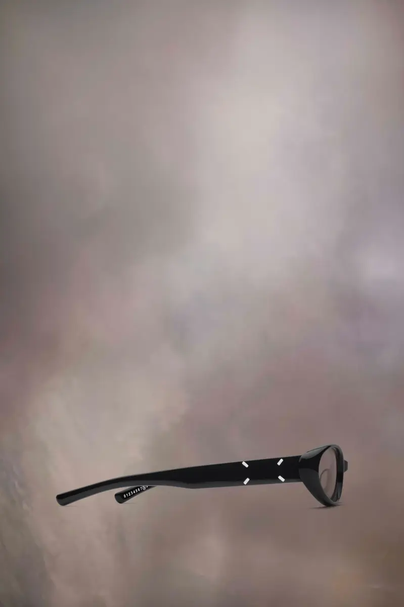 The MM213 01 glasses feature a cat-eye silhouette and tapered temples, embodying the fusion of classic and futuristic design in the third Maison Margiela x Gentle Monster collaboration. Maison Margiela’s signature, the Four Stitches, appear at the temples; the opposite of a label.
