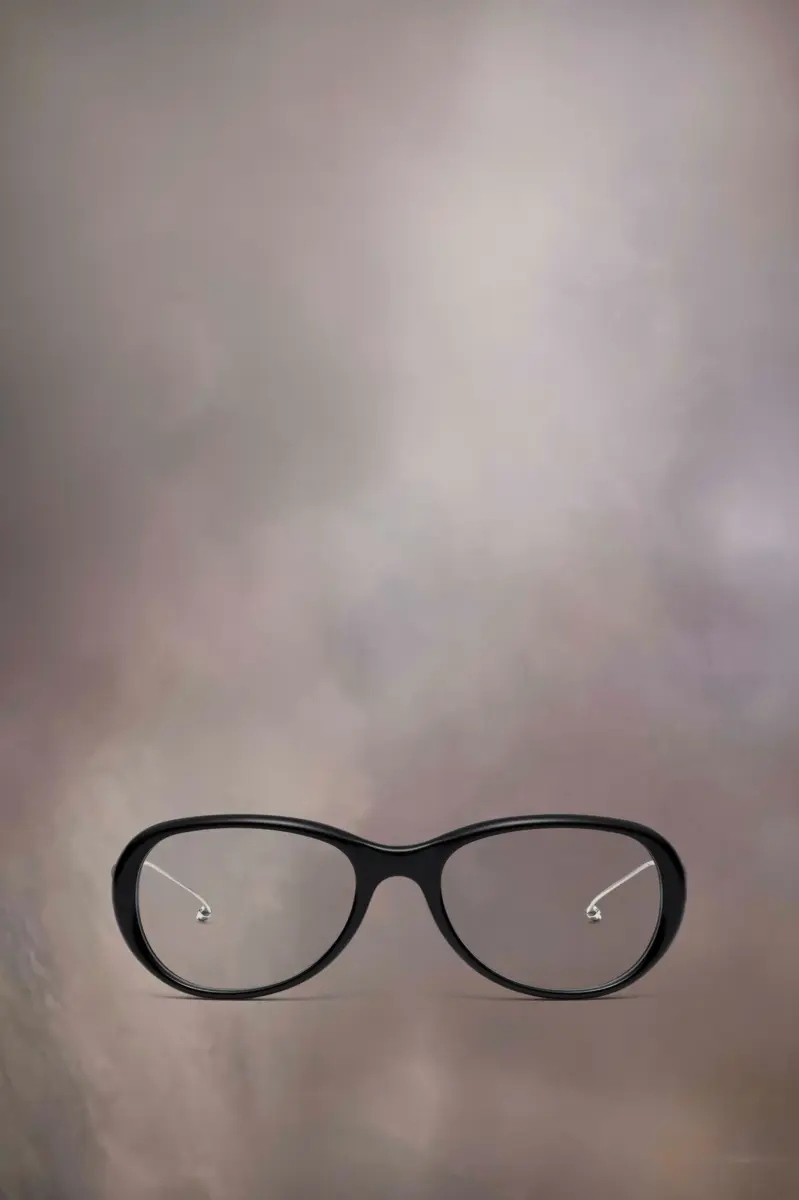 Crafted from acetate and titanium, the Maison Margiela x Gentle Monster MM215 01 glasses feature a clear lens and rounded shape. Inspired by the Maison Margiela Bolt & Nut accessories collection, with a matte texture and industrial hardware detail. Metal plates appear at the temple, engraved with the Maison Margiela logo.