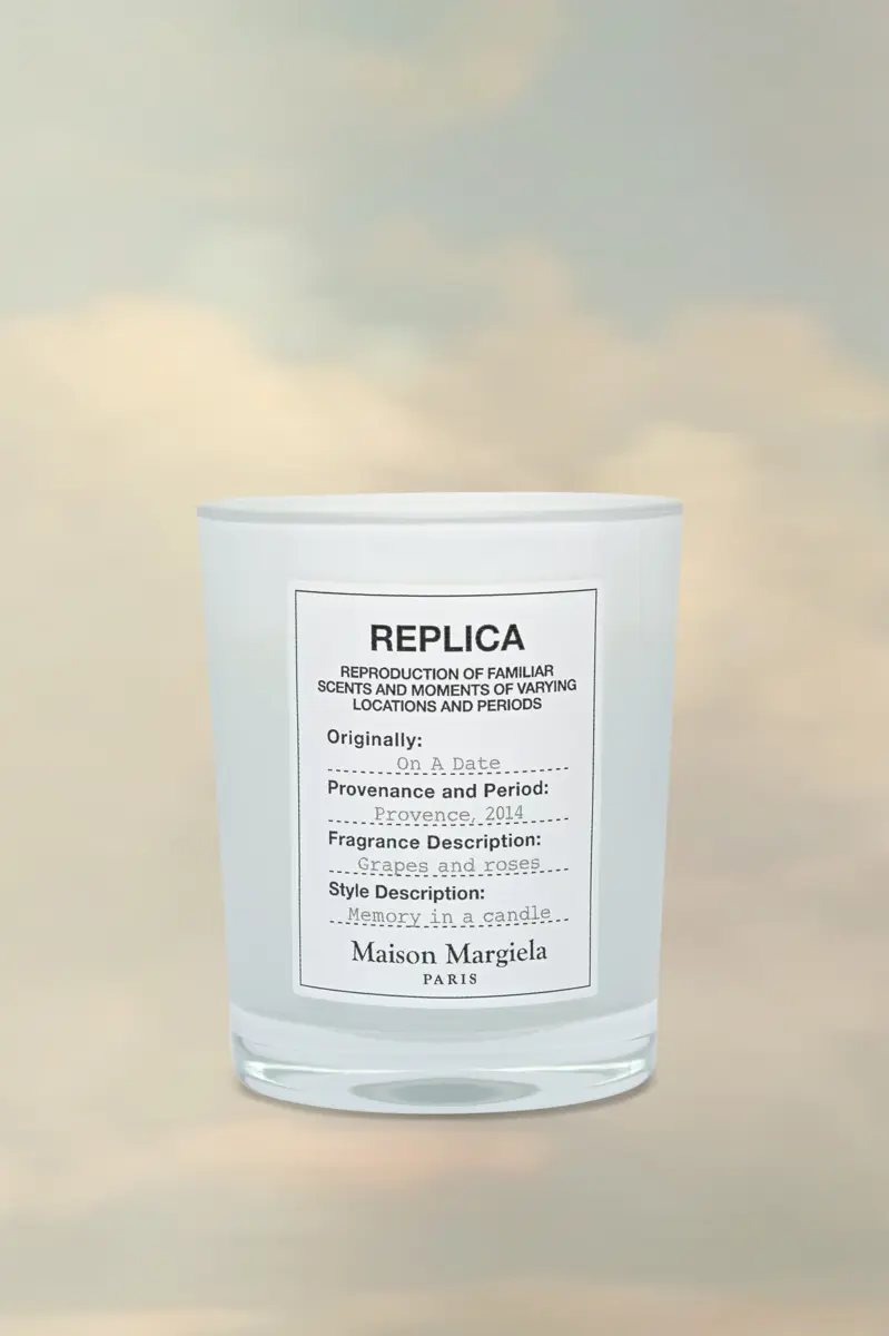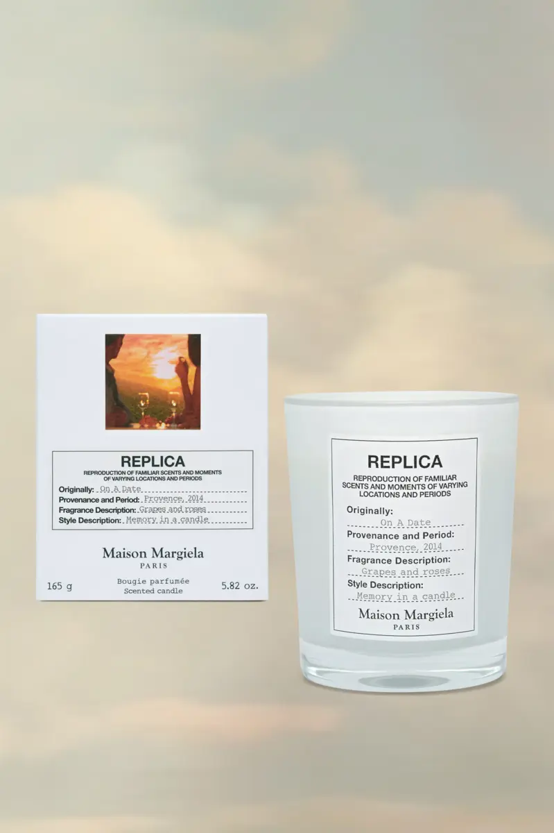 Replica On A Date Candle is a new thrilling scent inspired by a magical date on a late summer’s evening overlooking the magnificent vineyards of Provence at sunset. It captures the sparkling and addictive fruitiness of ripe grapes soaked in warm sunshine, and the delicate yet decisive character of wild roses. This perfume sets the senses on high with memories of dating and falling in love that are unique and profound. Made from high quality mineral wax, this cotton wick candle lasts up to 40 hours. Size 165g. The Replica collection assembles iconoclast fragrances that have the universal power to trigger personally cherished moments. In line with the Maison’s minimalistic approach, the Replica candle is simple yet sophisticated. A cotton label, resembling the tags used on clothing and accessories for the Replica fashion collection, identifies each fragrance.