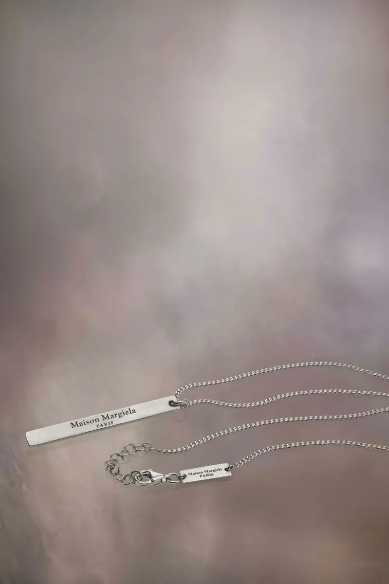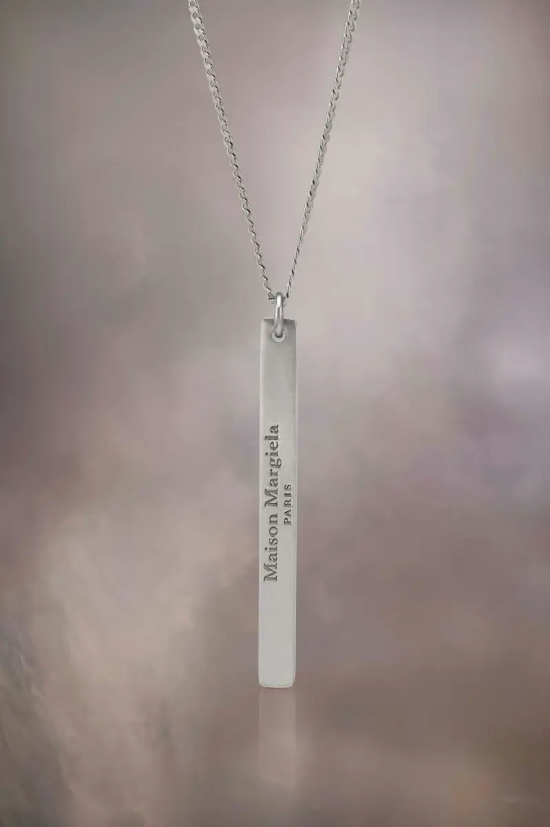 Crafted from semi-polished sterling silver, the necklace presents a long, slim pendant engraved with the Maison Margiela logo.