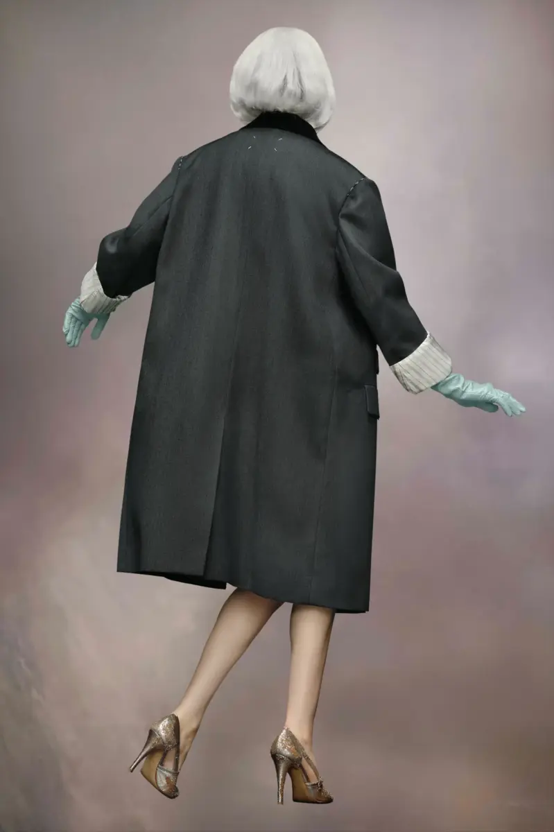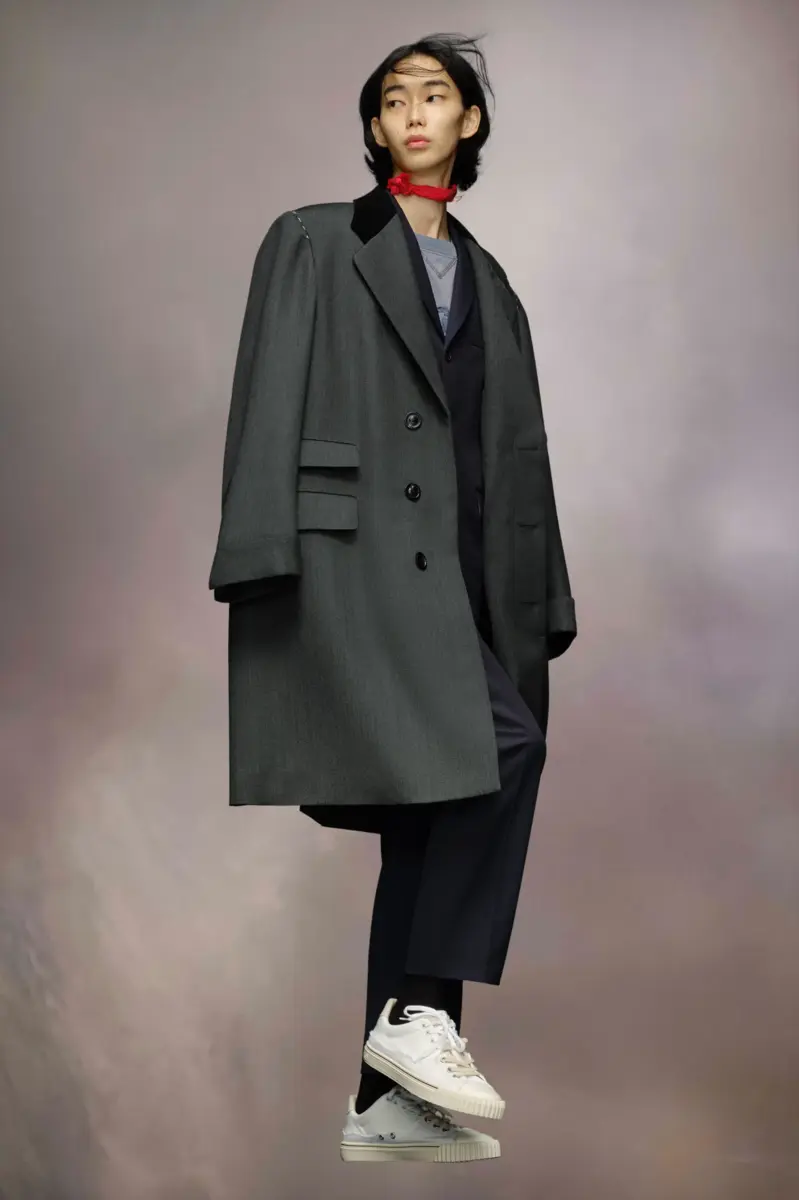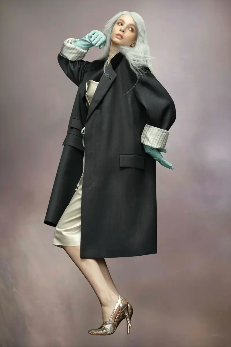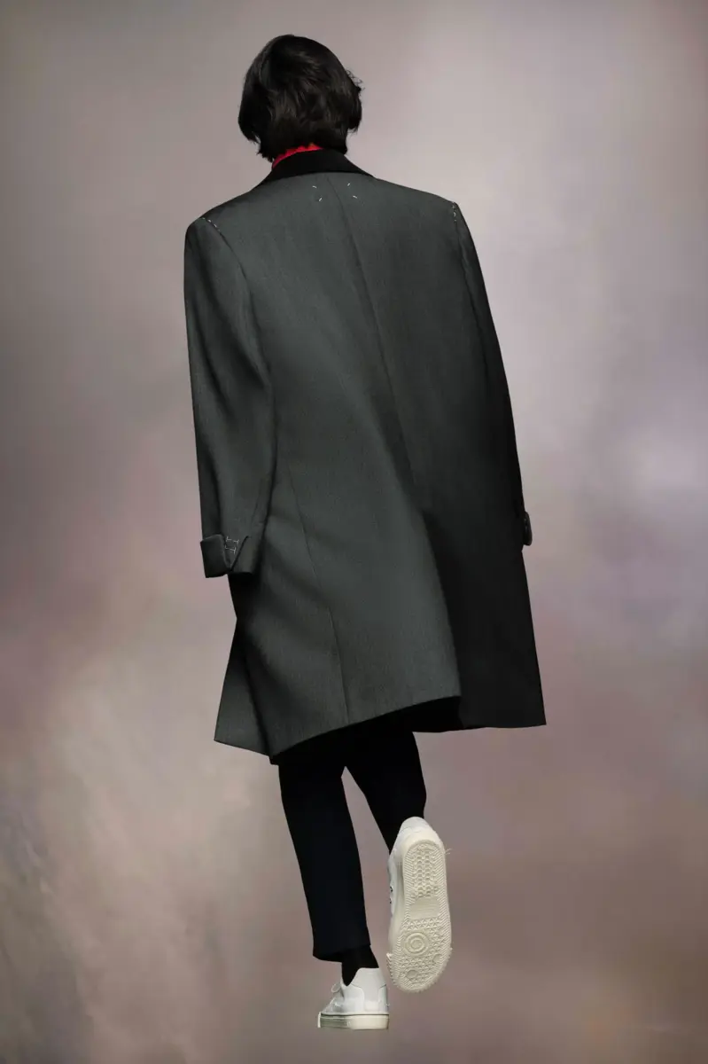 The wool coat features the Maison’s work-in-progress stitch details at the shoulders with asymmetric flap pockets and a hidden buttoned placket for a clean aspect. It features a contrast collar and sleeves that can be rolled up to showcase the lining. Margiela’s signature, the four stitches, appear at the back; the opposite of a label.