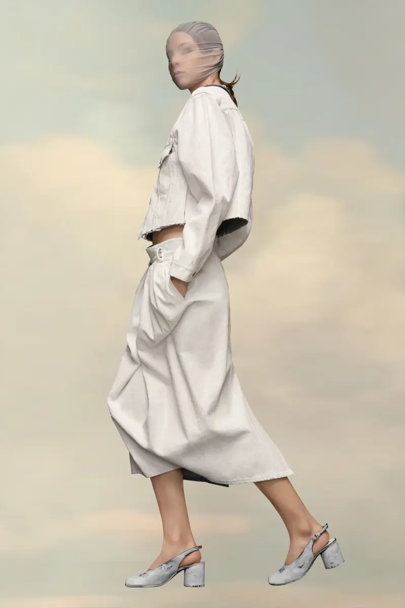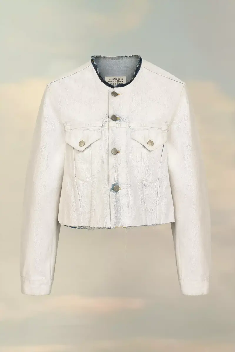 This fitted collarless denim jacket is cropped at the waist and has a cracked white effect. It features classic metal hardware and seam detailing. The contrast neck has a raw finish and the back shows the four white stitches, showing the hand of the Maison: the opposite of a label.