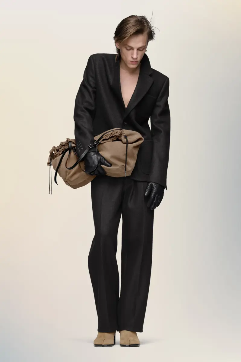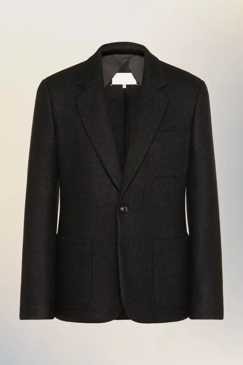 This jacket is crafted in felted wool for soft structure and natural weight. Designed with a sharp lapel and relaxed silhouette, it features oversized patch pockets and stitched detailing at the cuffs – a subtle expression of subversive tailoring. At the back, the Maison’s signature four stitches appear; the opposite of a label.