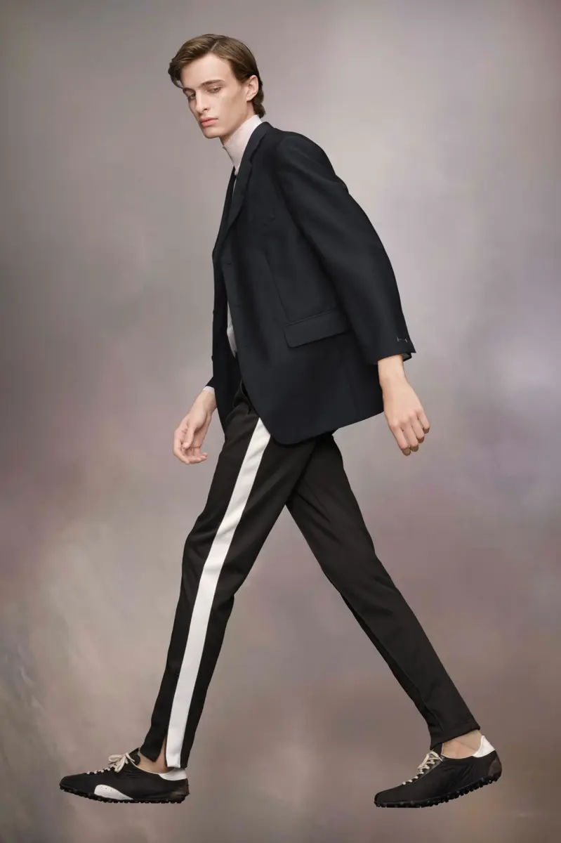 Crafted from mohair wool, the suit jacket is single-breasted and features a notched collar. It is completed with flap pockets at the sides and a chest pocket. The cuffs are designed with the work-in-progress contrast stitching, offsetting the tailored aesthetic. Maison Margiela’s signature, the four stitches, appear at the back; the opposite of a label.