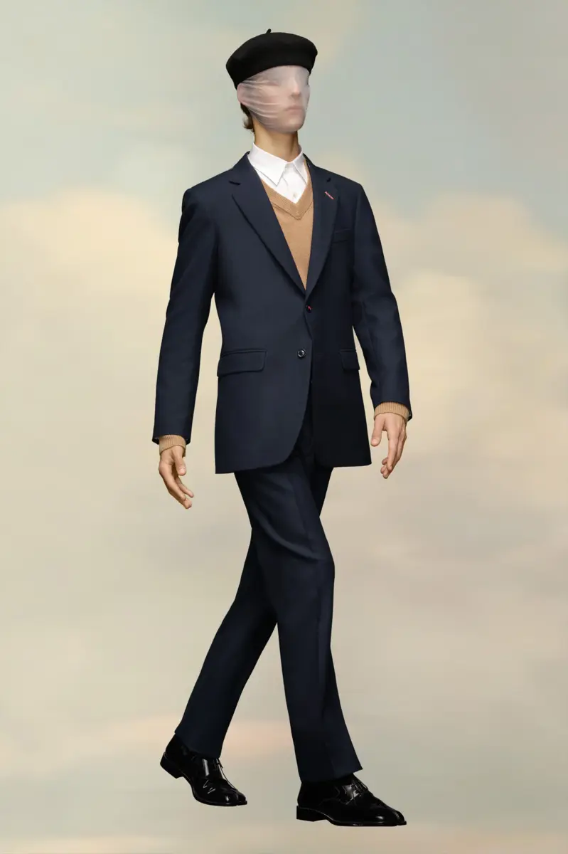 In wool twill, this single-breasted blazer presents the M button and work-in-progress stitching. A vent finishes the back.