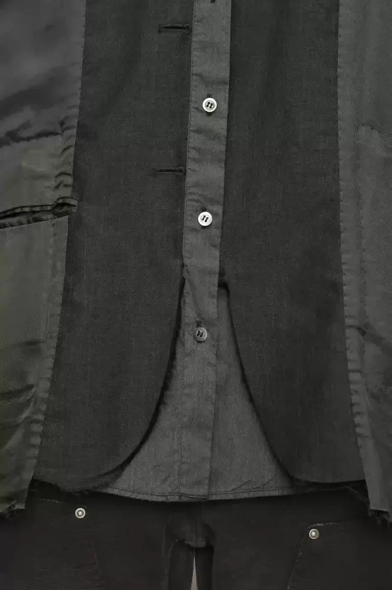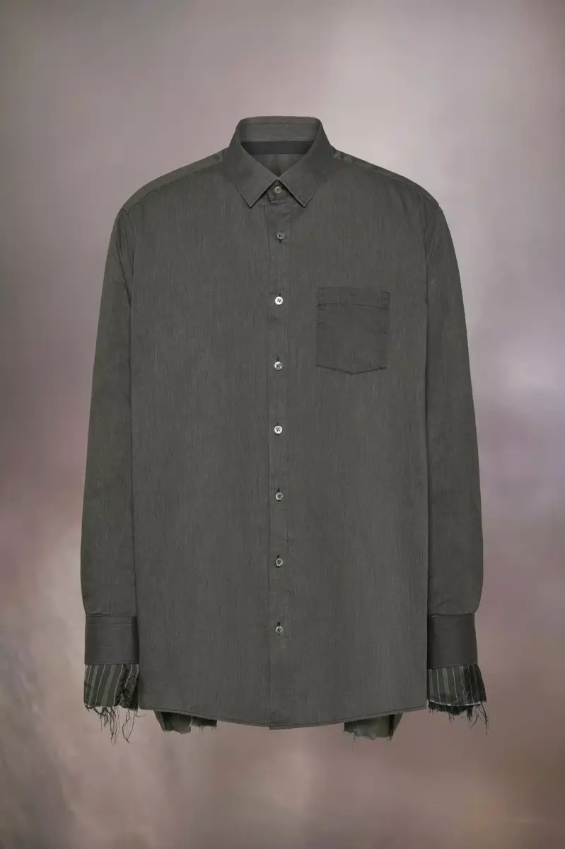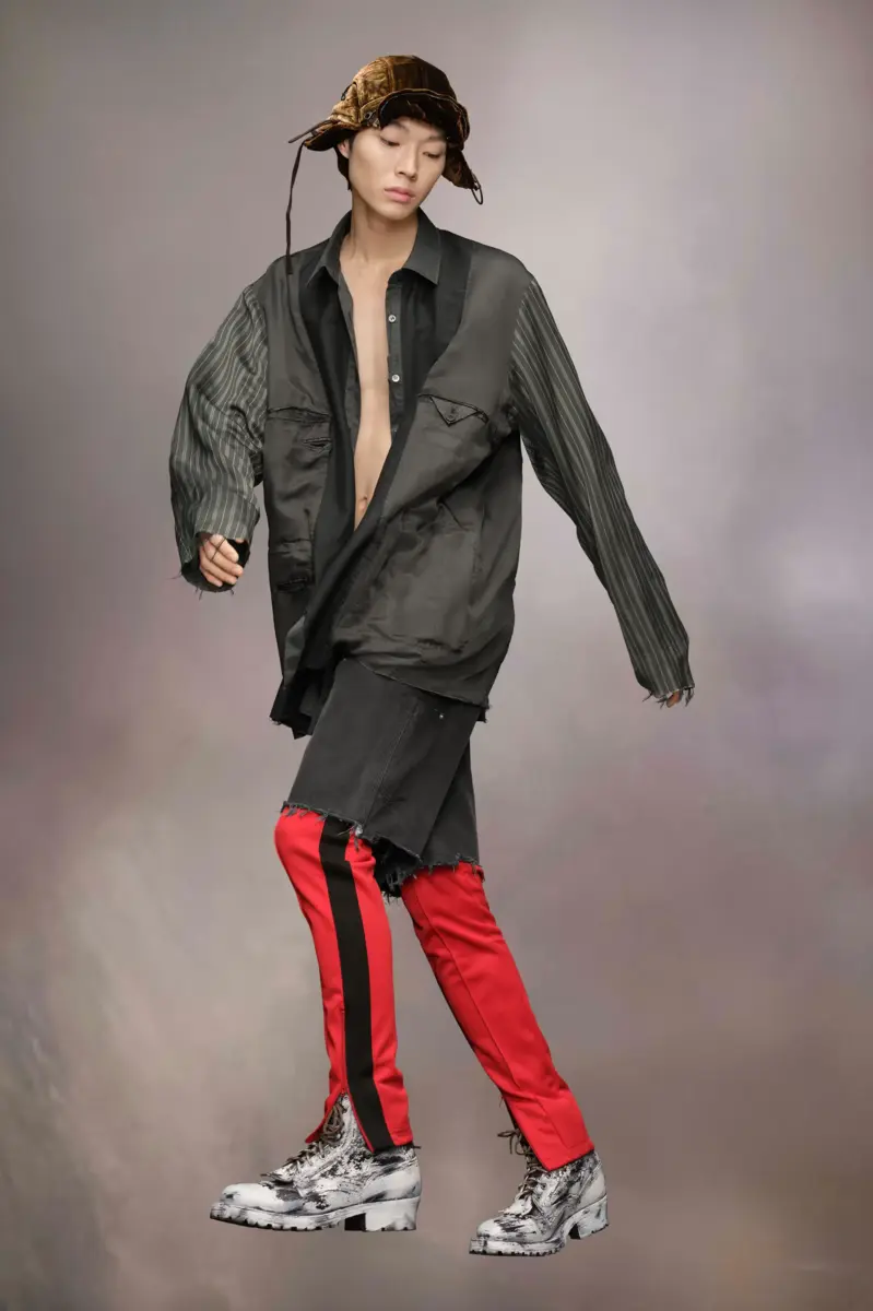The jacket explores the Maison’s Anonymity of the lining concept with an inside-out, unfinished feel hinting at the fluidity of the creative process. Striped sleeves with raw edges contrast the layered front panels, complete with buttoned placket, classic collar and pockets. Maison Margiela’s signature, the four stitches, appear at the back; the opposite of a label.
