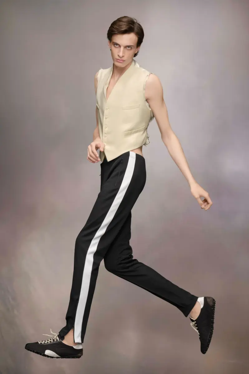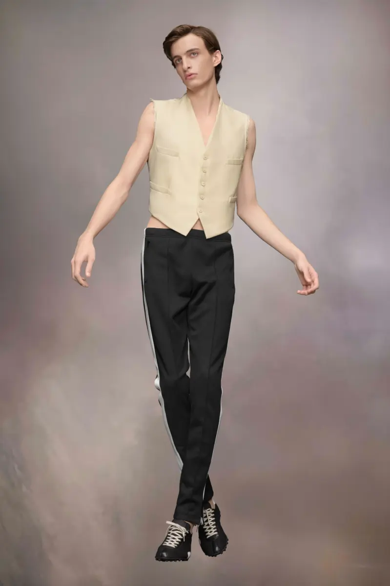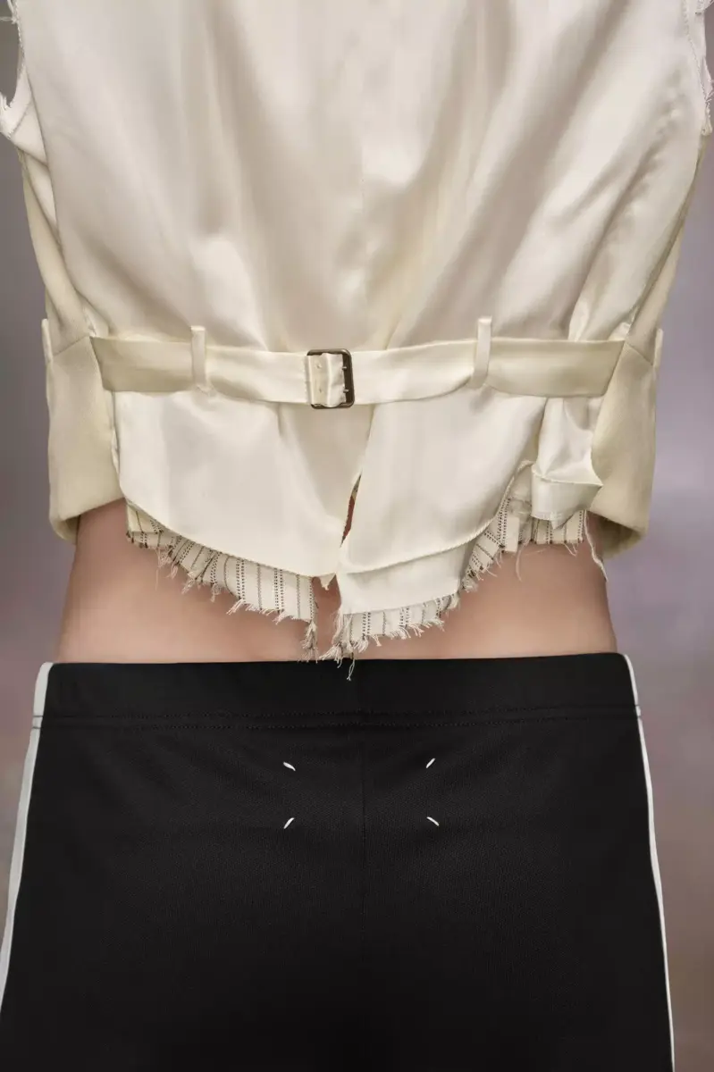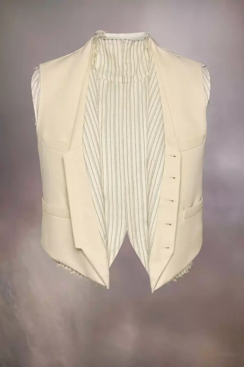 Crafted from wool, the waistcoat demonstrates the Maison’s Anonymity of the lining concept. It is double layered and can also be worn buttoned up as a top. It features distressed elements, with the formal pointed edges at the front offset by the torn shoulders and neckline. It features a buckle at the back for an adjustable fit. Maison Margiela’s signature, the four stitches, appear at the back; the opposite of a label.