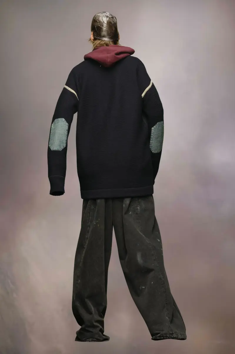 This V-neck knit cardigan features denim mending contrast elbow patches and frayed piping at the shoulders. Maison Margiela’s signature, the four white stitches, appear at the back; the opposite of a label. Gauge 7.