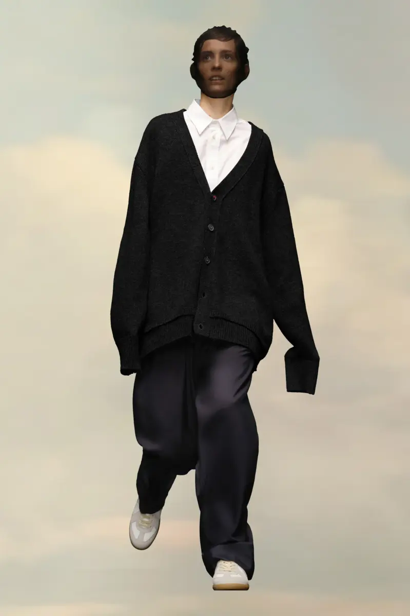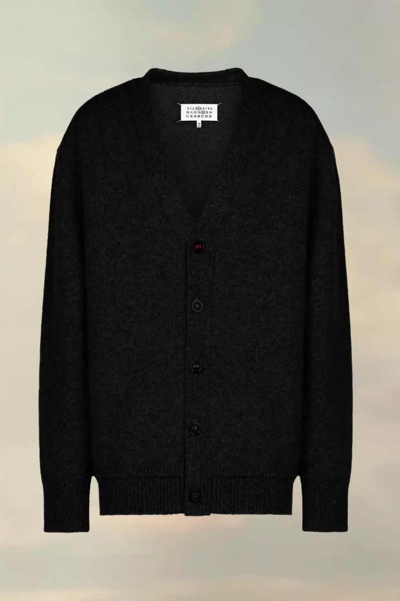 This low V-neck knit cardigan with long sleeves and ribbed trims features tonal elbow patches. At the back, four white stitches show the hand of the Maison: the opposite of a label. Gauge 5.