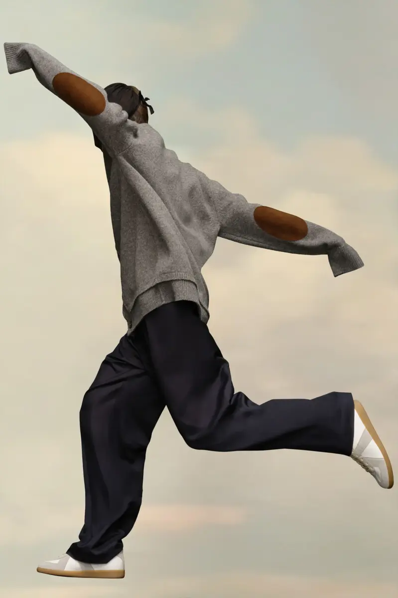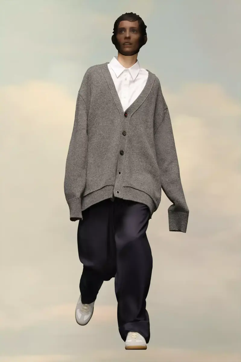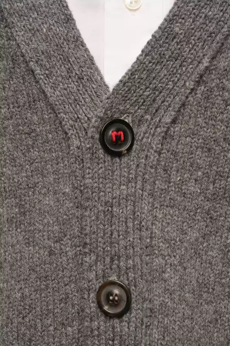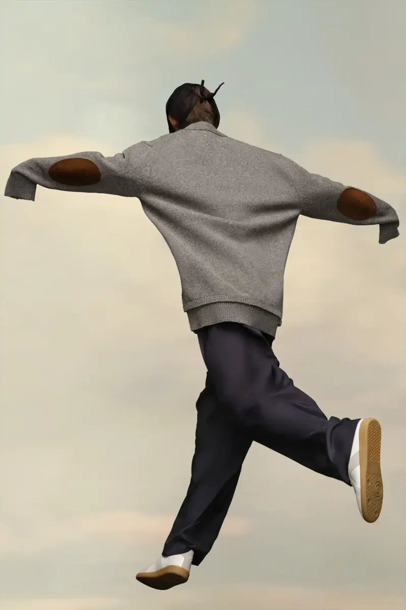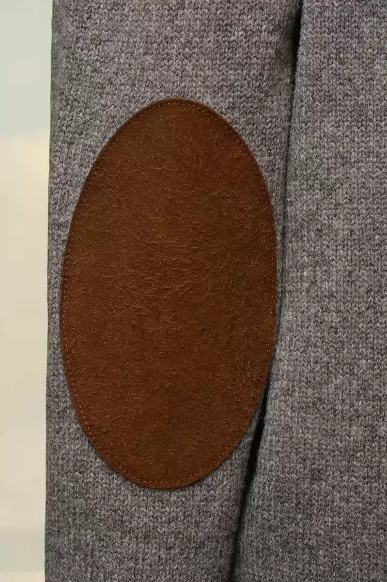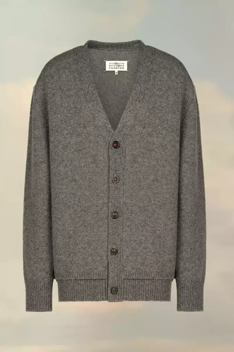 This low V-neck knit cardigan with long sleeves and ribbed trims features tonal elbow patches. At the back, four white stitches show the hand of the Maison: the opposite of a label. Gauge 5.