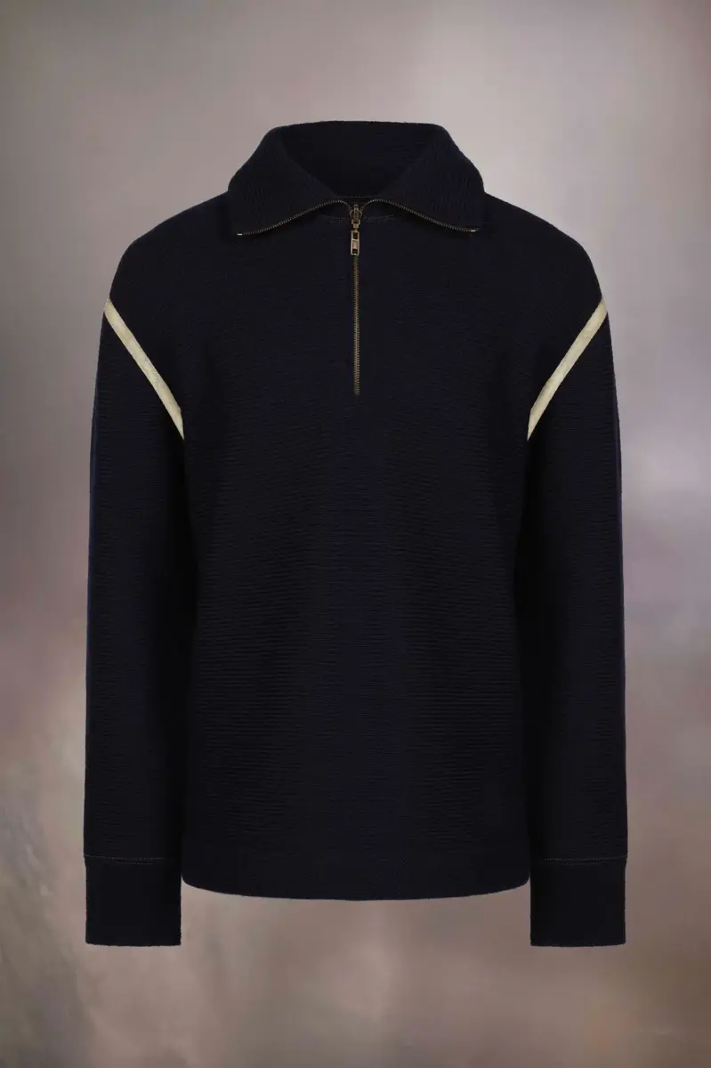 The elbow patch knit sweater features a half-zip neckline, denim mending contrast elbow patches and frayed piping at the shoulders. Maison Margiela’s signature, the four white stitches, appear at the back; the opposite of a label. Gauge 7.