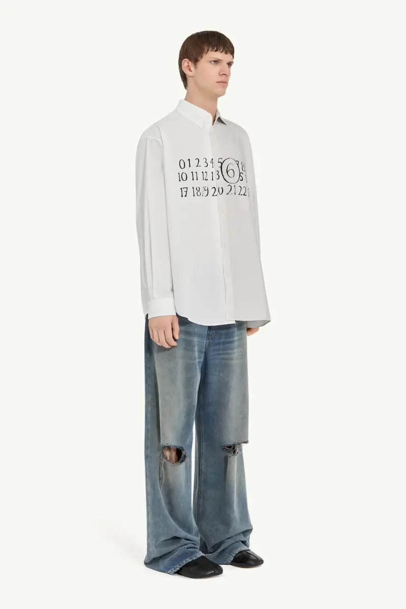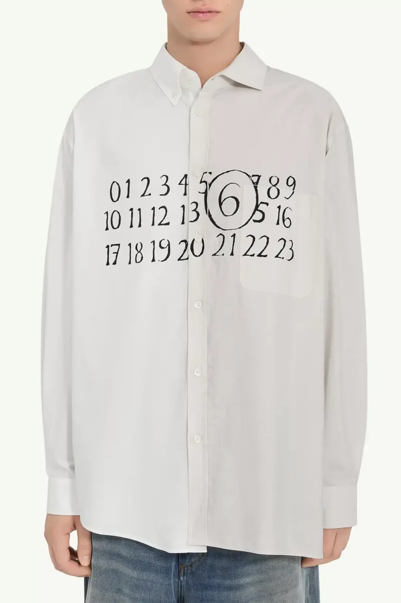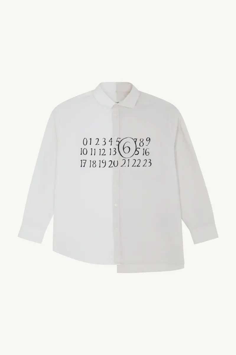In tune with MM6’s deliberately unmade tailoring, this shirt boldly contrasts plain and striped panels for a striking visual effect. The handwritten text print at the front introduces artistic flair, while the asymmetric hem underscores the fusion of contrasting styles. Buttoned cuffs add structure, with the white stitch line at the back reinforcing the Maison’s signature deconstructive approach.