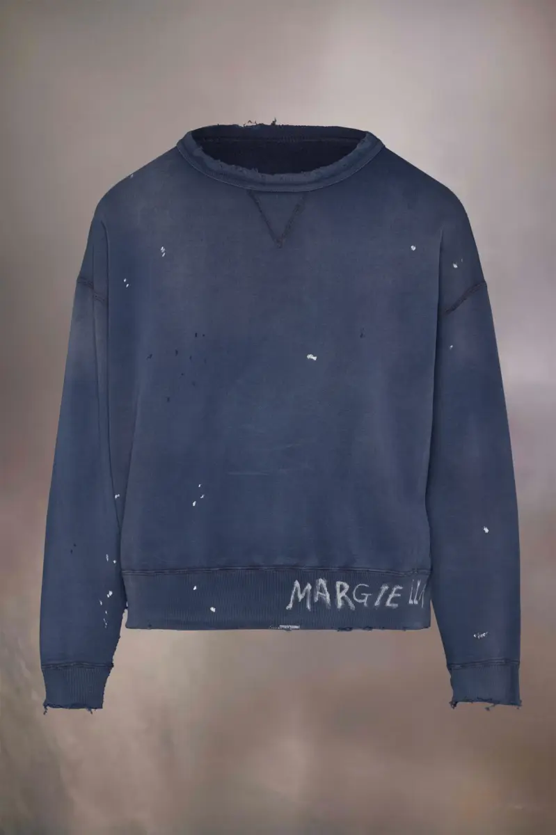 In organic cotton fleece, the round-neck sweatshirt features slashed long sleeves and a handwritten Margiela logo at the hem. Raw edges present an undone aesthetic. Maison Margiela’s signature, the Four stitches, appear at the back; the opposite of a label.