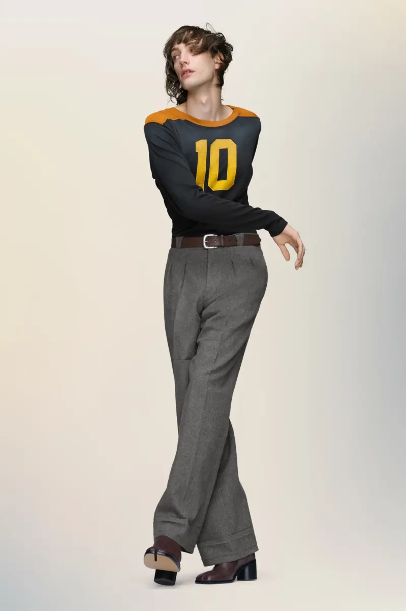 A play on vintage athleticwear, this long-sleeved jersey is designed with textured contrast panels at the collar and shoulders, with a bold varsity-style appliqué across the chest. Treated using the Maison’s Sun Faded technique, the fabric is softened to evoke the nostalgic patina of timeworn materials. Maison Margiela’s signature, the four stitches, appear at the back; the opposite of a label.