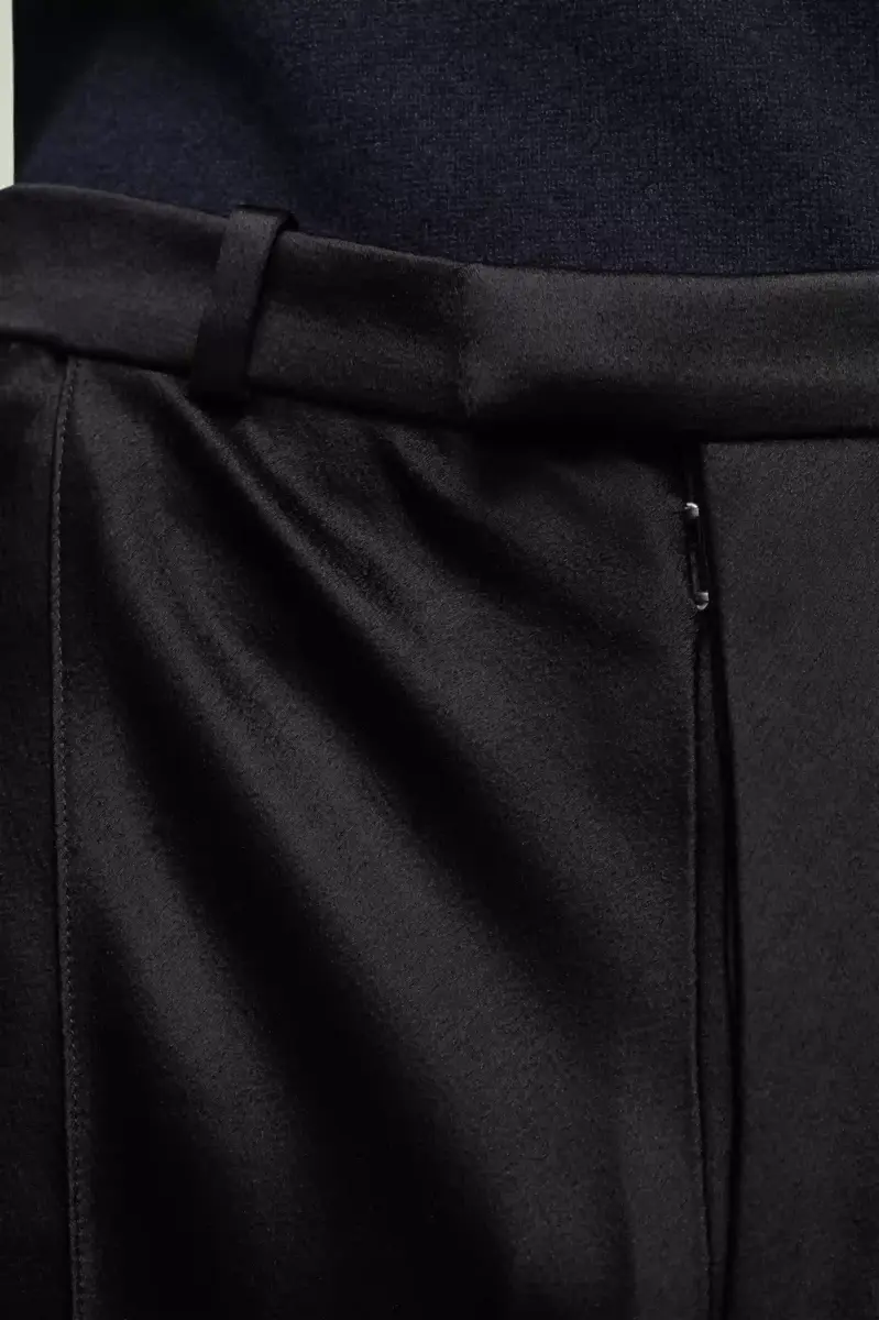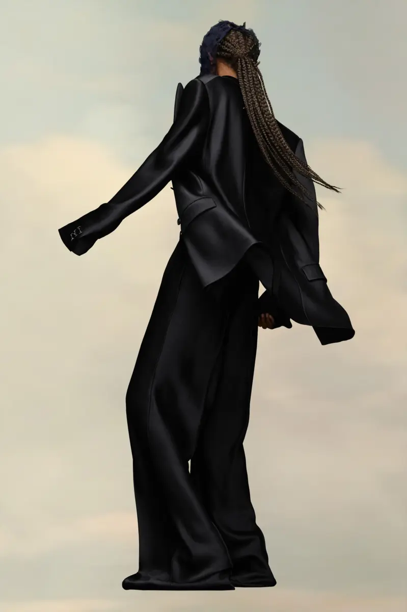 Crafted from satin, this two-piece suit has a double-breasted blazer with notched collar and oversized trousers. The cuff show the Maison’s memory of concept and an asymmetric M button is featured. At the back, the four white stitches show the hand of the Maison: the opposite of a label.