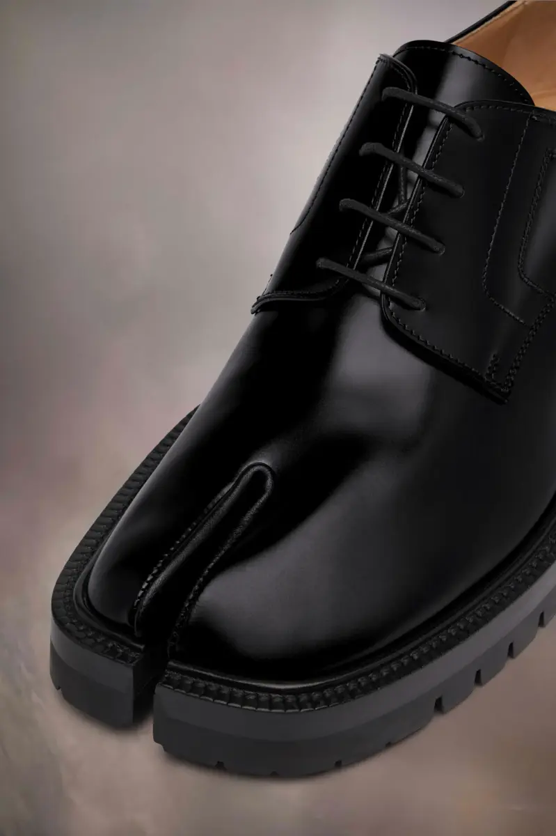 In brushed calfskin, the lace-up shoes feature a chunky cleated sole and the Tabi split-toe, inspired by the traditional 15th century Japanese sock bearing the same name – launched for the Maison’s debut collection in 1989. It captures the avant-garde and insubordinate spirit of the Maison and exists as a heritage classic, continually explored through each collection.