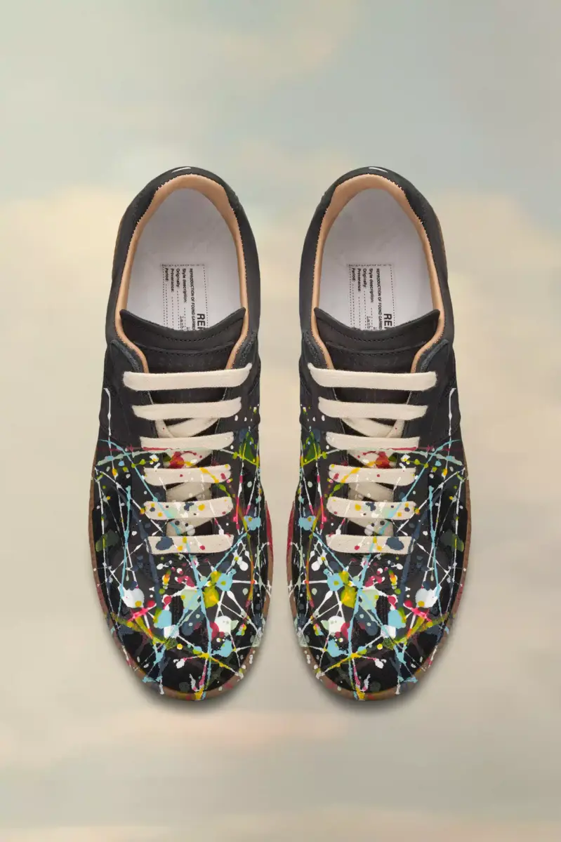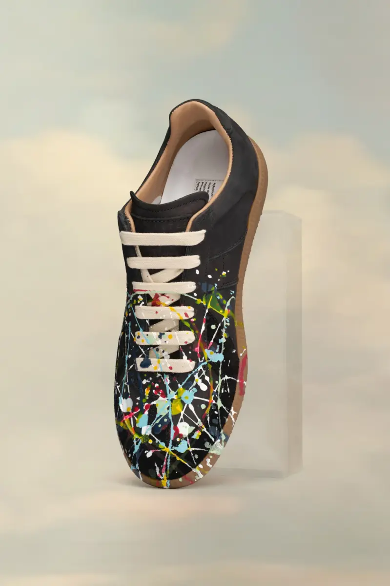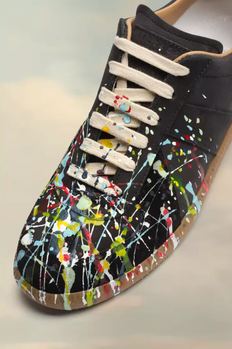 The Replica sneakers in nubuck leather and velour featuring a paint splatter design. The Maison’s iconic Replica sneakers are inspired by Austrian sports shoes from the seventies. Details on the Replica pairs are continually reworked in line with the season’s inspirations.