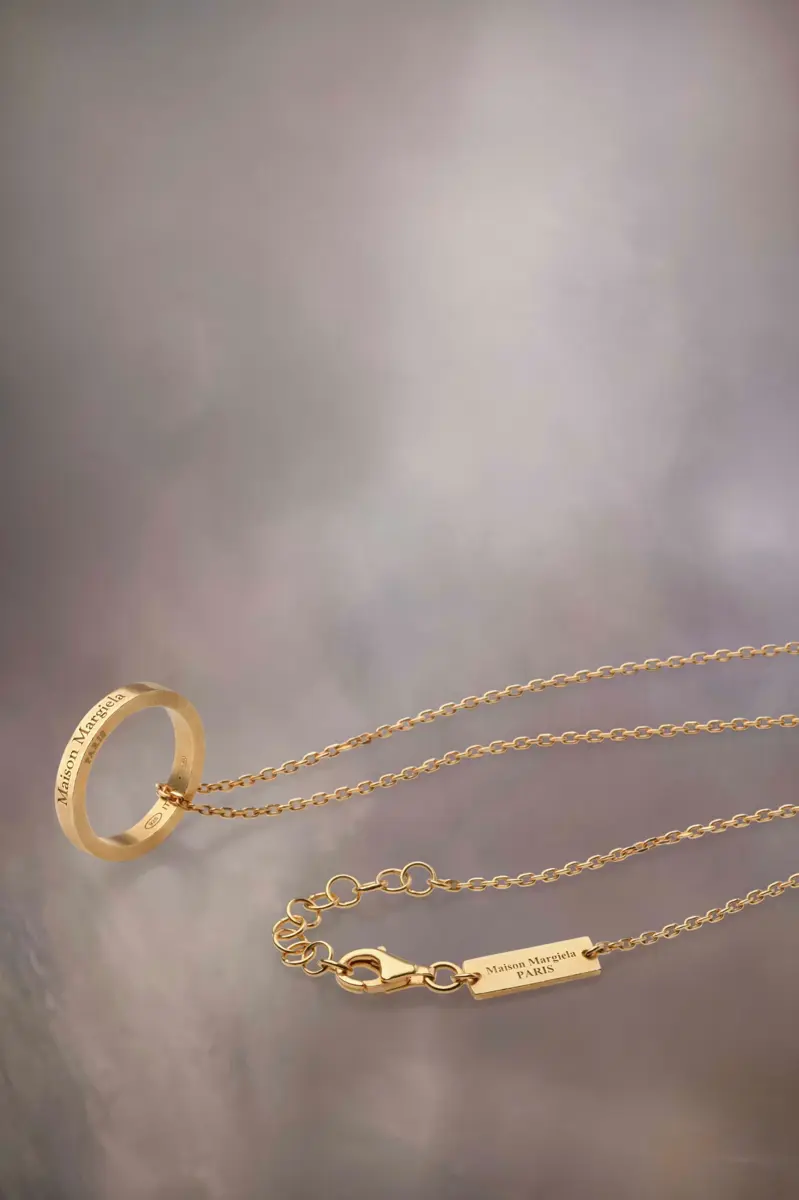 The ring with yellow gold plating, with an engraved Maison Margiela logo, hangs as a pendant on a slim chain.