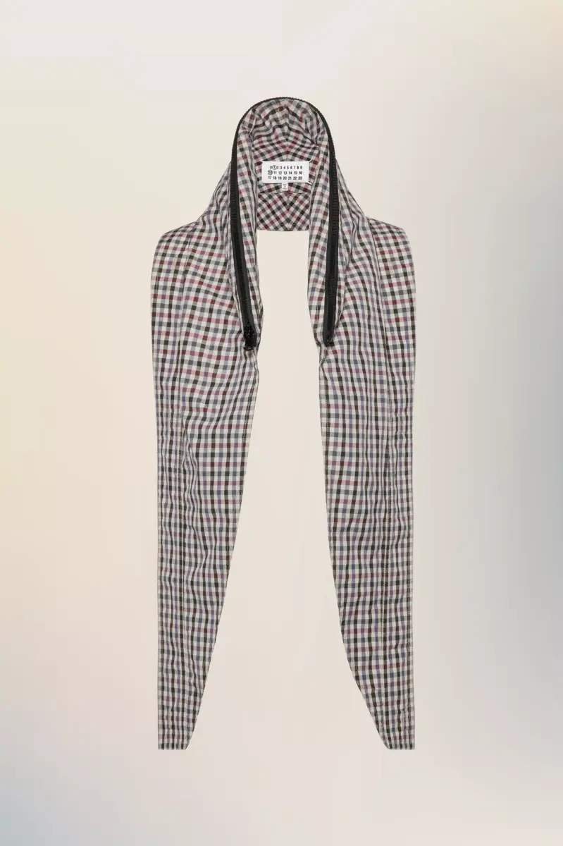 Crafted in a lightweight, water-repellent fabric with a soft crinkle finish, this checked headscarf reinterprets a classic British staple once favoured for countryside pursuits and royal engagements. A zip-up hood and adjustable drawstring offers multiple styling options. Maison Margiela’s signature, the four stitches, appear at the back; the opposite of a label.