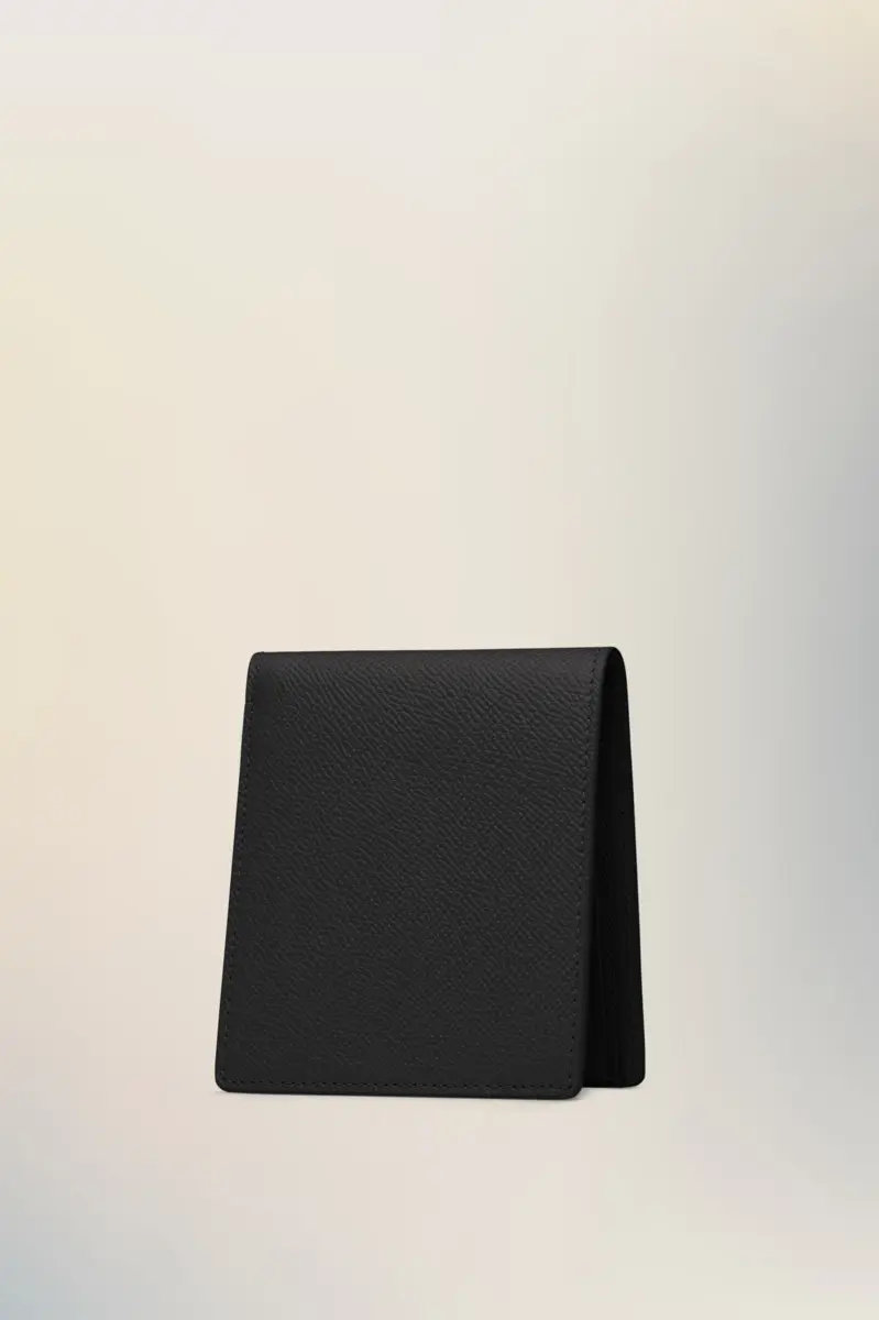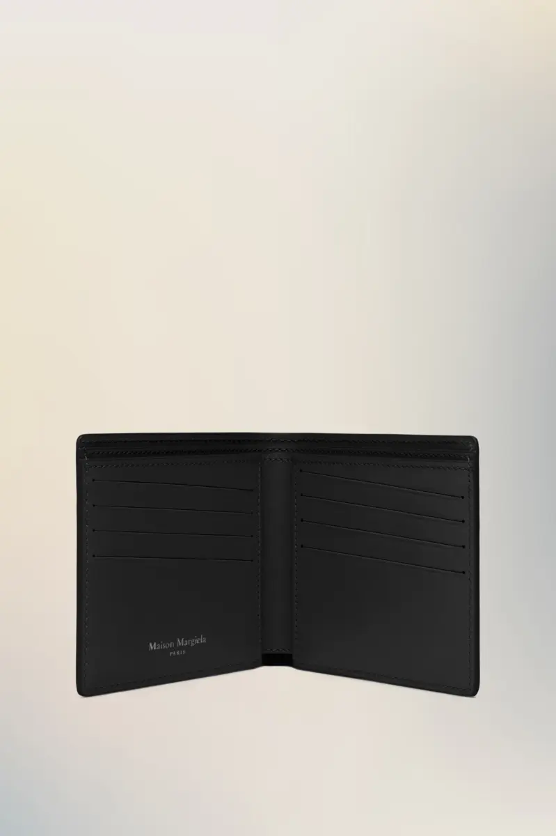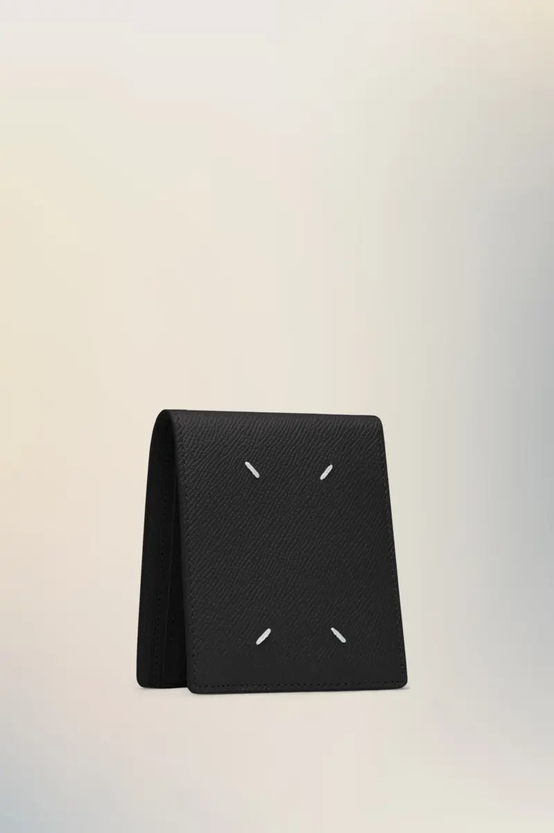 The cardholder has eight card slots and sections for notes. It is crafted from grainy leather with the logo inside. Maison Margiela’s signature, the four stitches, appear on the back; the opposite of a label.