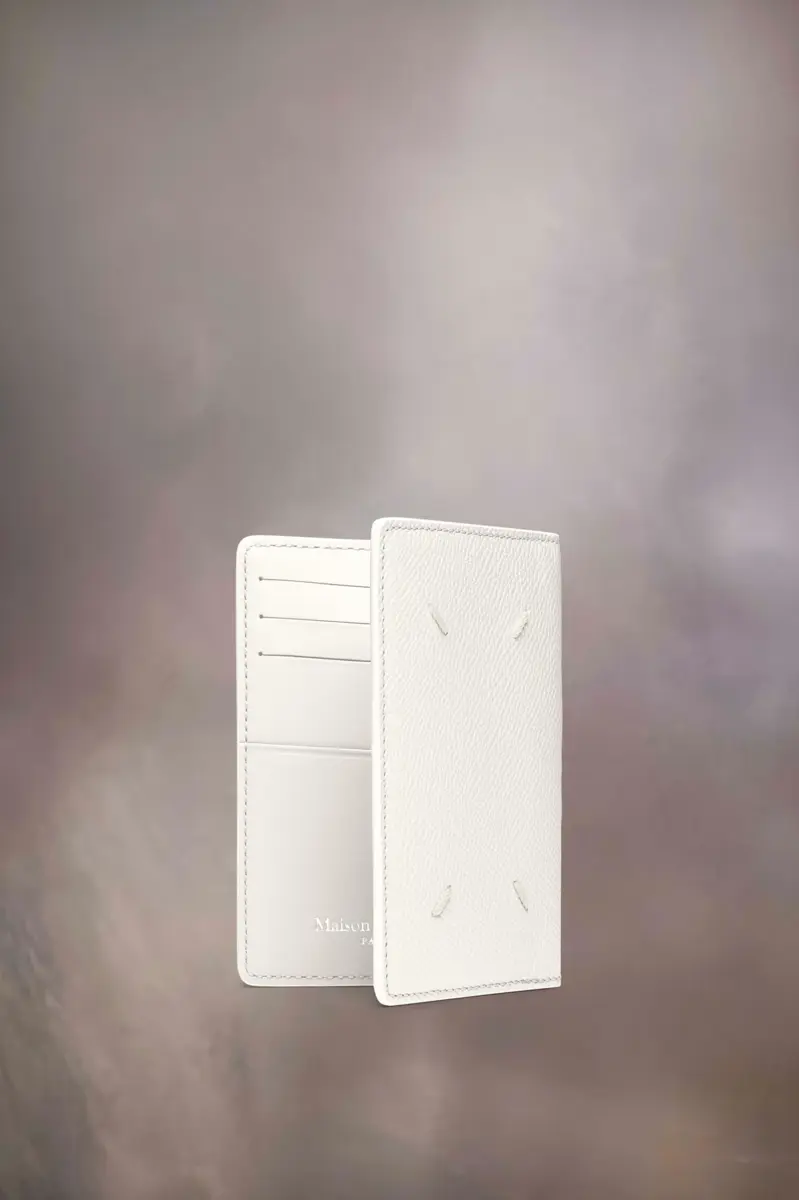 The cardholder has four card slots and sections for notes. It is crafted from grainy leather with the logo inside. Maison Margiela’s signature, the four stitches, appear on the back; the opposite of a label.