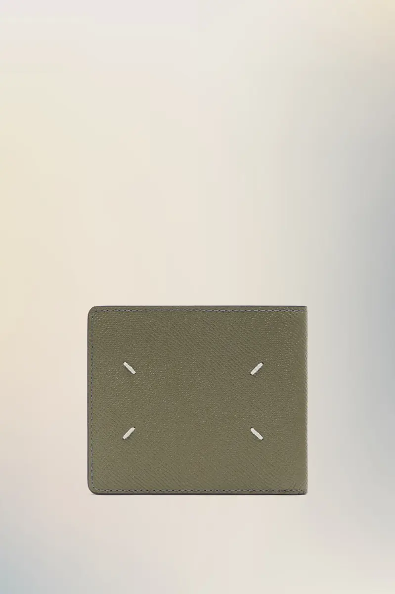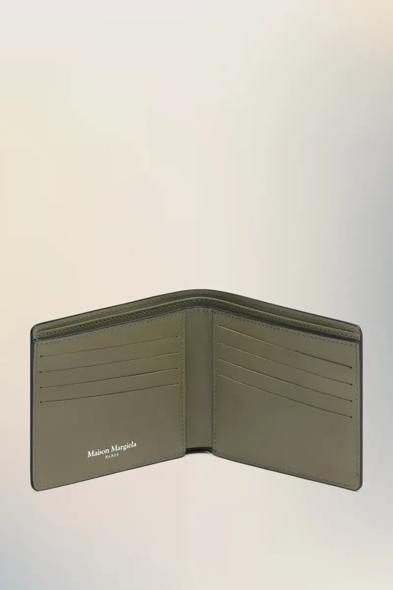 The cardholder has eight card slots and sections for notes. It is crafted from grainy leather with the logo inside. Maison Margiela’s signature, the four stitches, appear on the back; the opposite of a label.
