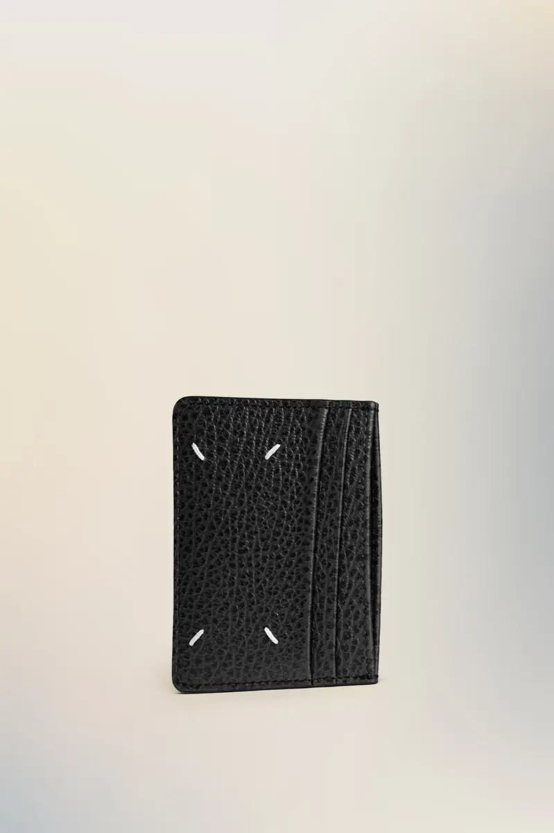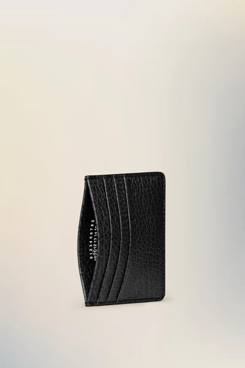 The cardholder comes in embossed grainy leather with five card slots and a middle section with the numeric logo inside. Maison Margiela’s signature, the four stitches, appear on the back; the opposite of a label.