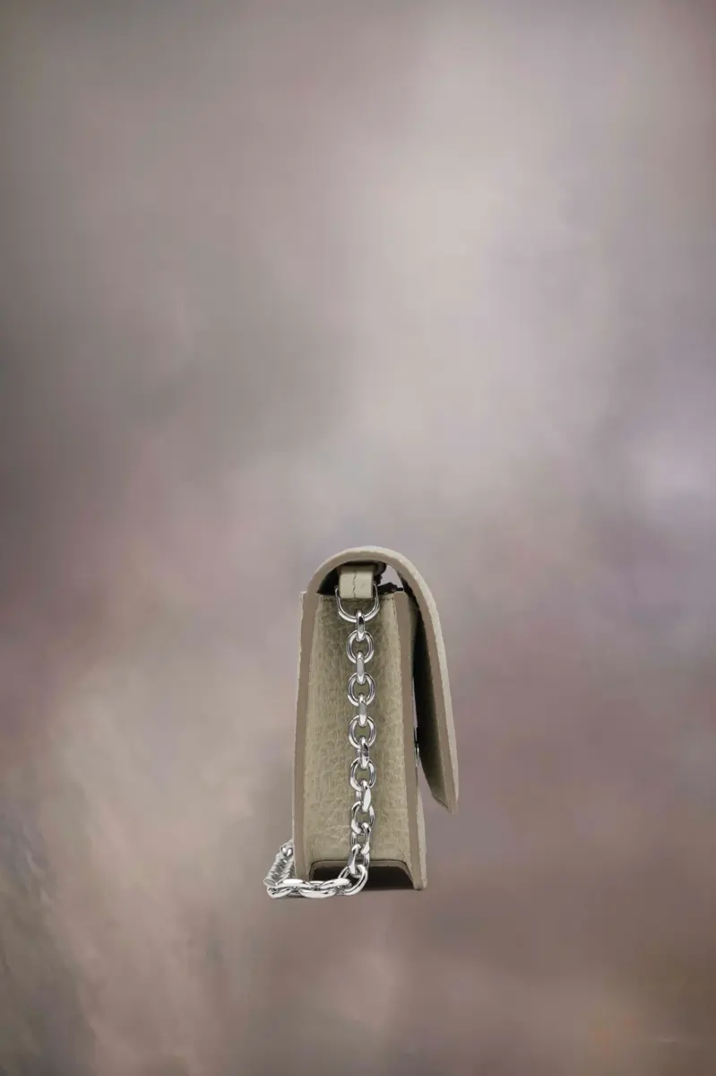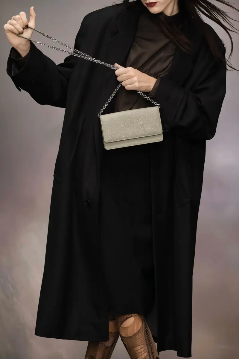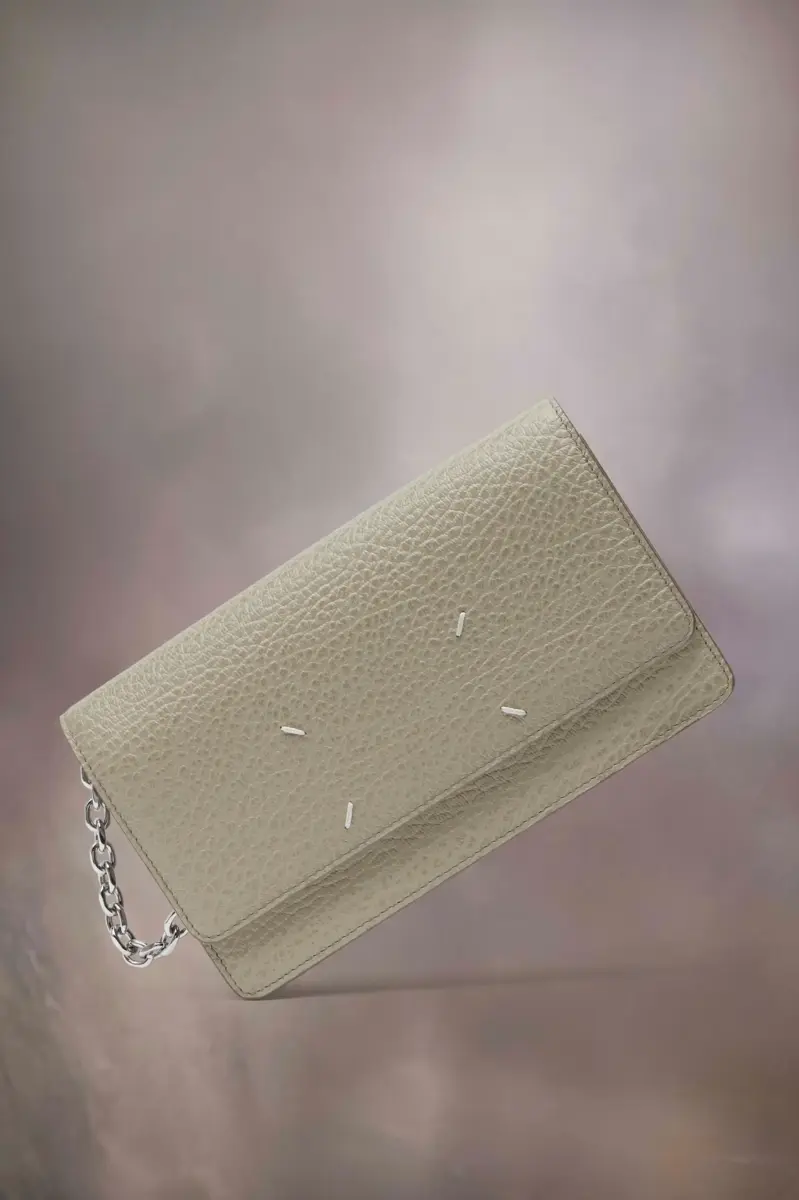 In embossed grainy leather with a chain, the wallet has a snap button closure and zipped inner section. It features the numeric logo inside. Maison Margiela’s signature, the four stitches, appear on the flap; the opposite of a label.