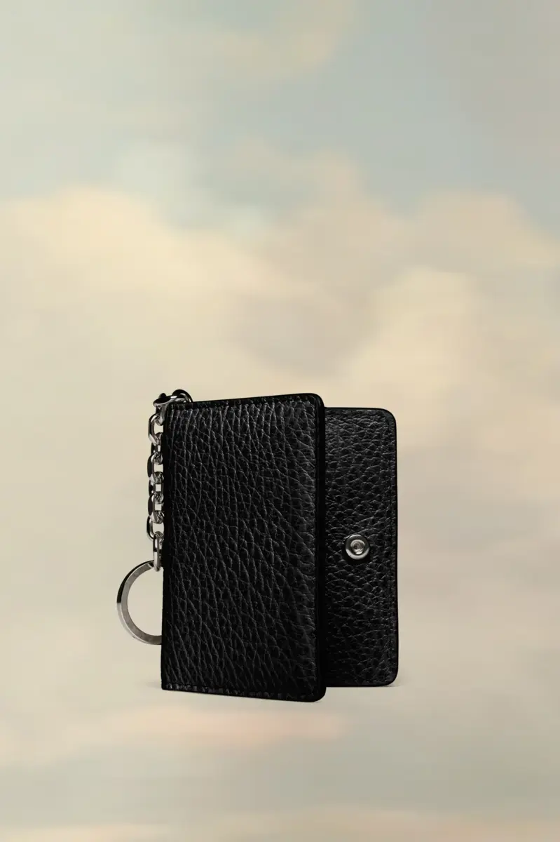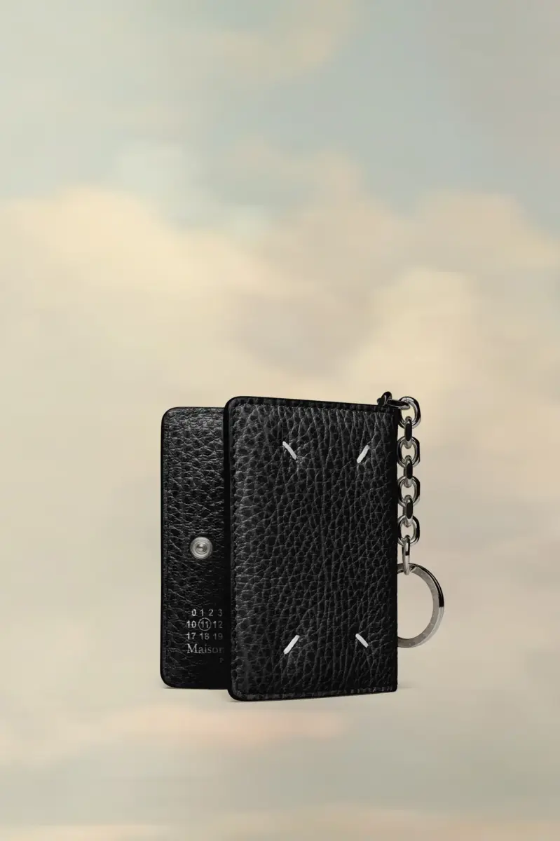 Crafted from embossed grainy leather, the cardholder has a keyring chain, snap button closure and multiple card holders. Maison Margiela’s signature, the four stitches, appear at the back; the opposite of a label.
