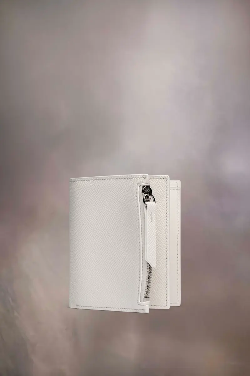 The wallet is crafted from grainy leather and features eight card holders, a zipped purse and the logo across three sections. Maison Margiela’s signature, the four stitches, appear on the back; the opposite of a label.
