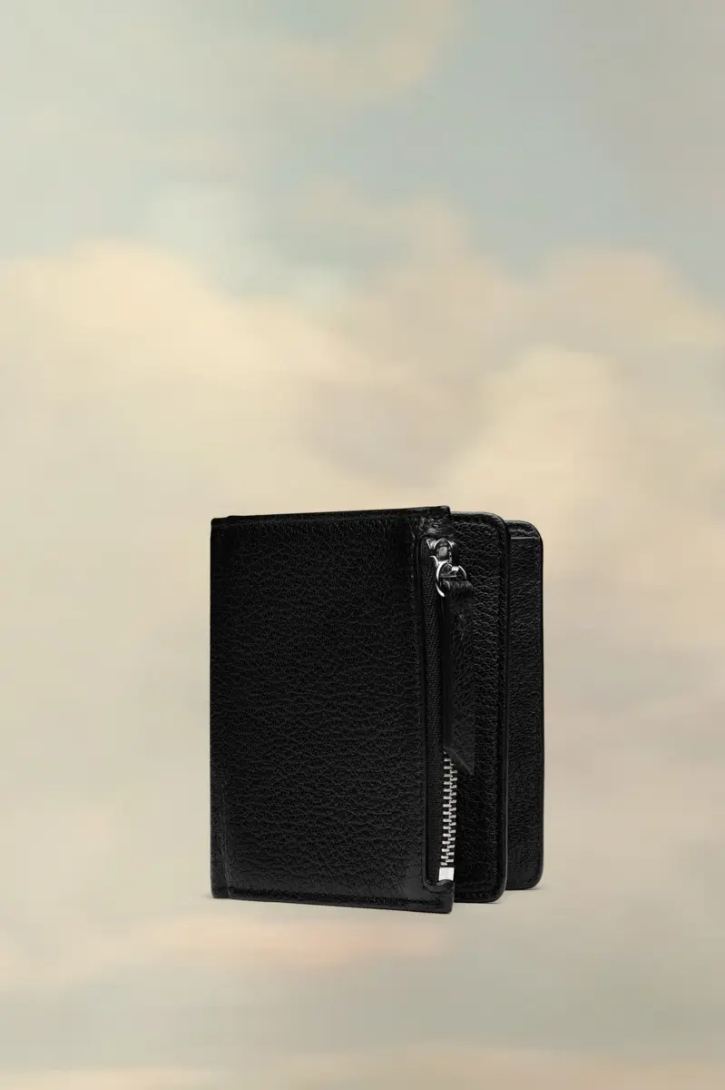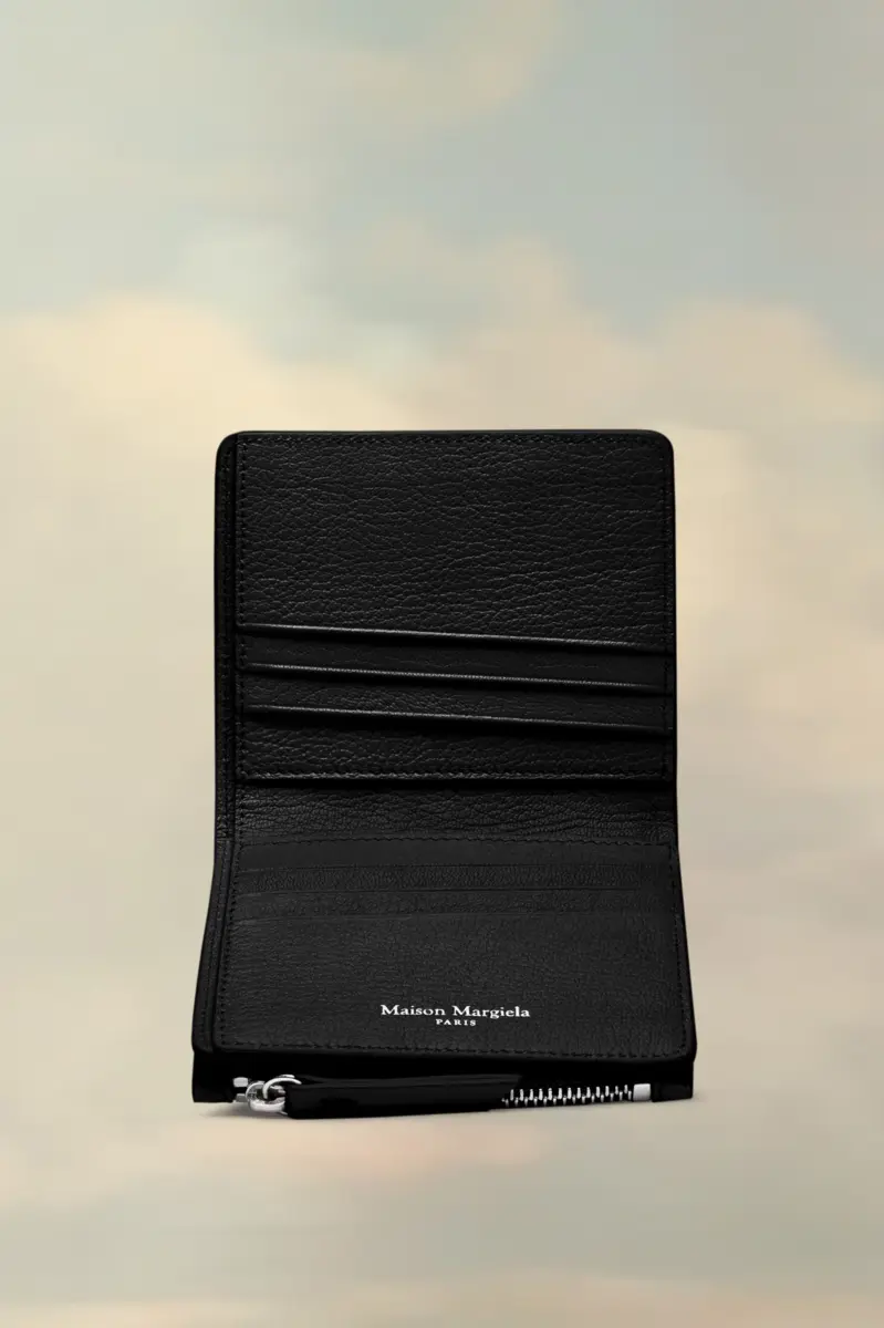 The wallet is crafted from goat leather and features eight card slots, a zipped purse and the logo across three sections. Maison Margiela’s signature, the four stitches, appear on the back; the opposite of a label.