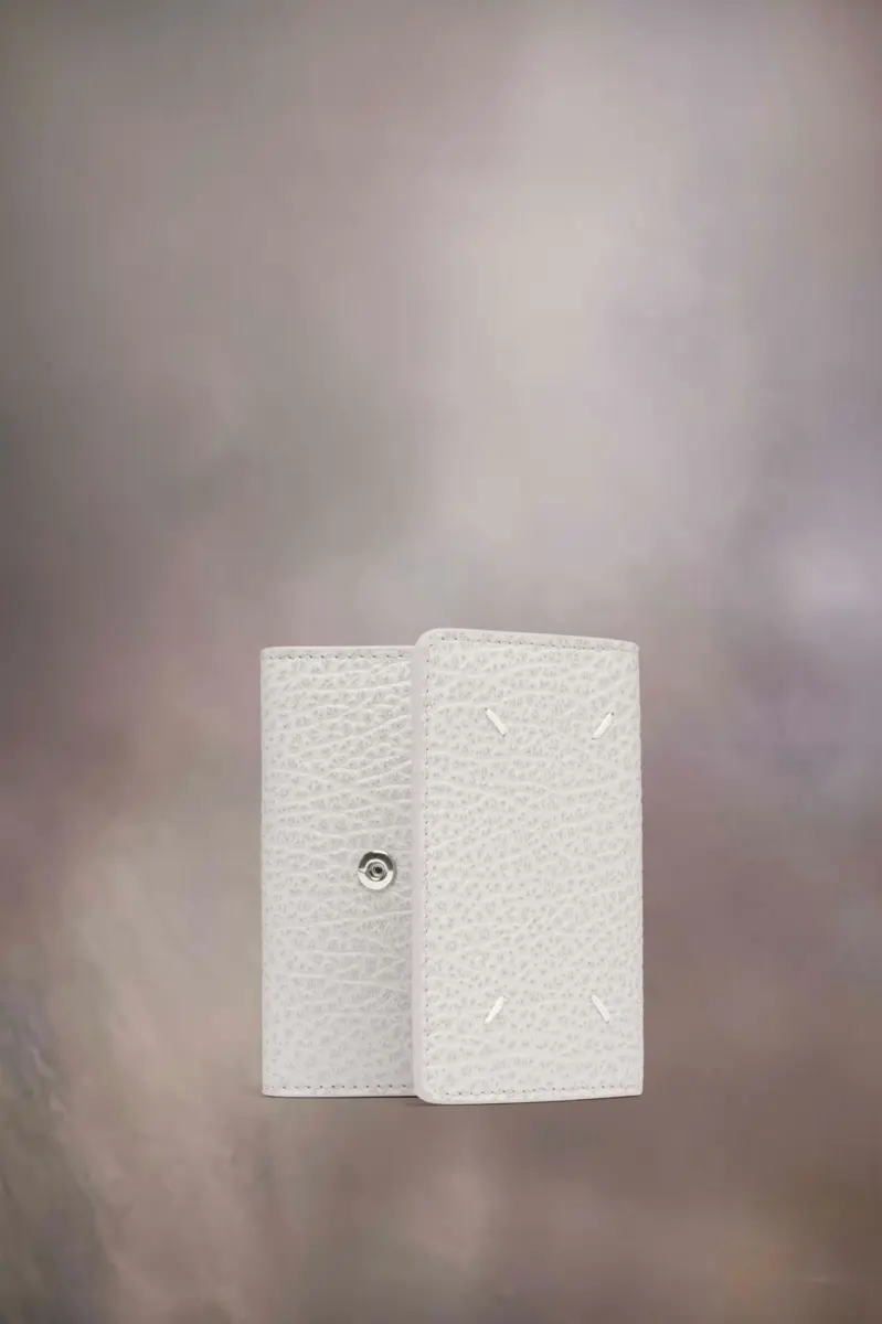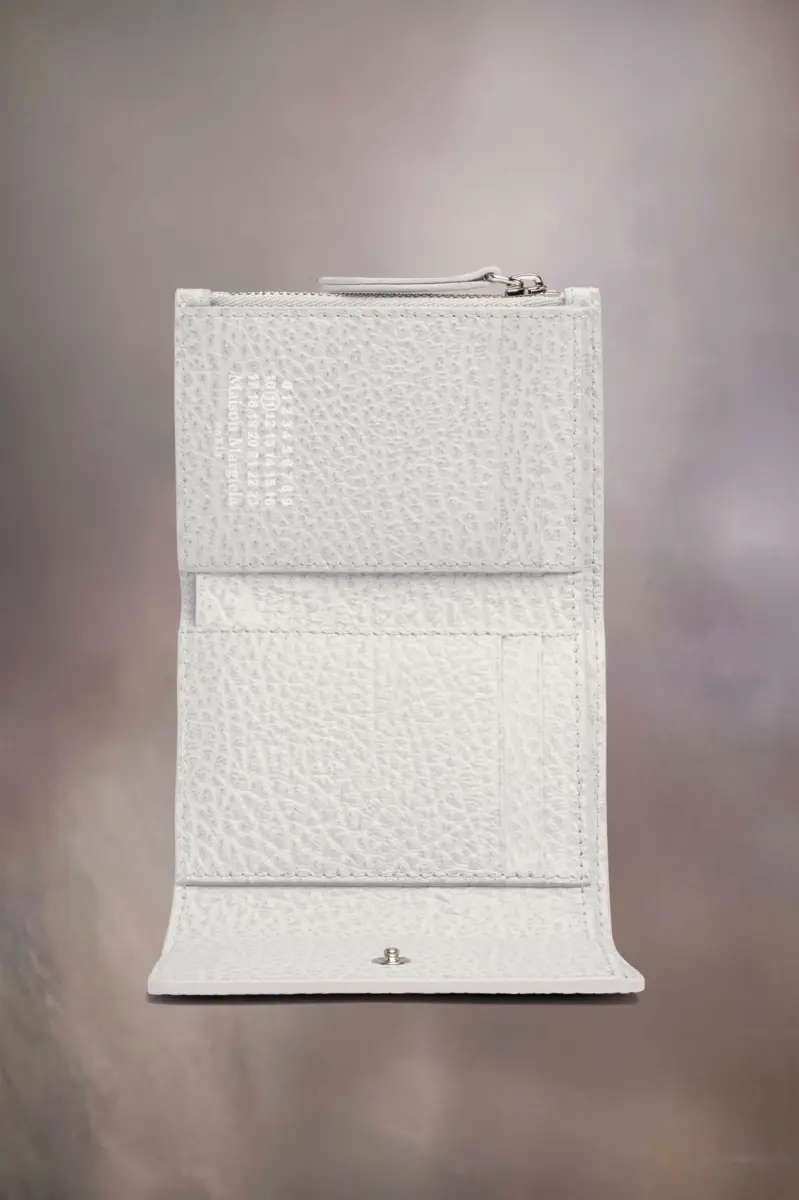In embossed grainy leather, the wallet features the numeric logo inside with four card holders and a zipped section. Maison Margiela’s signature, the four stitches, appear on the back; the opposite of a label.