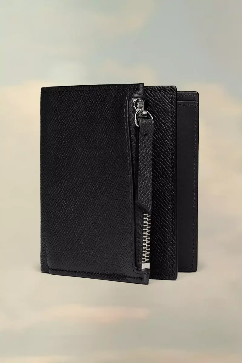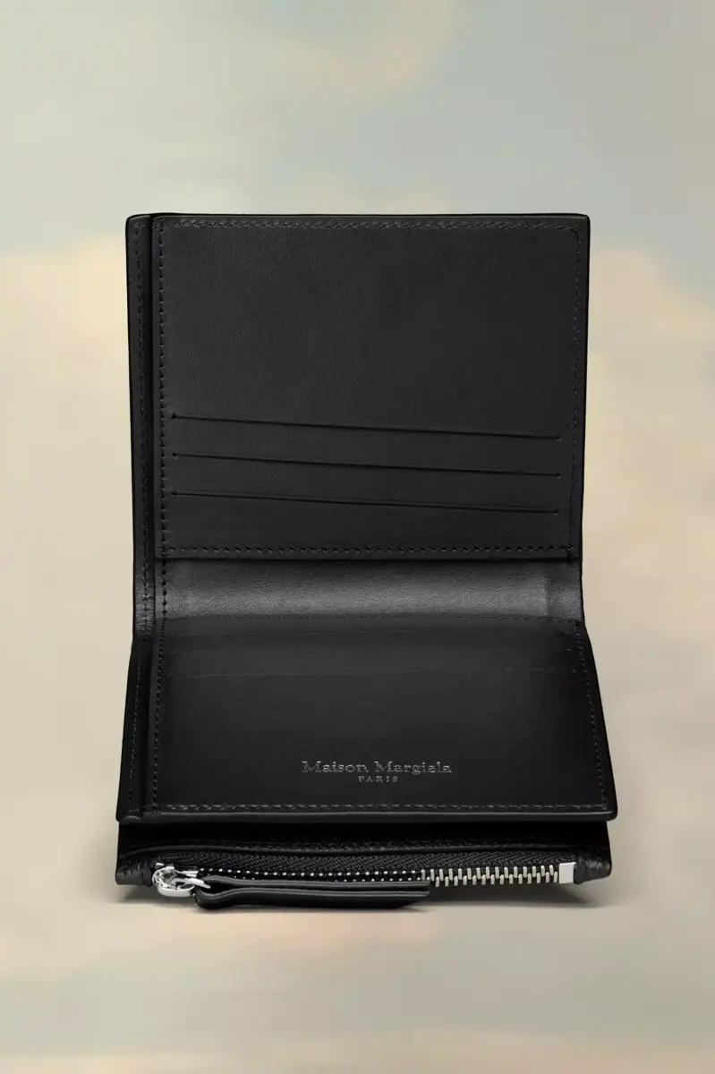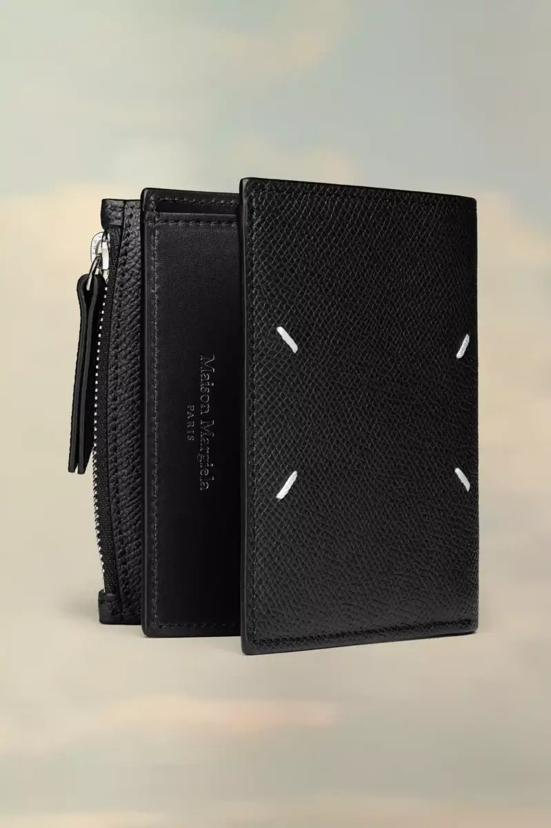 The wallet is crafted from grainy leather and features eight card holders, a zipped purse and the logo across three sections. Maison Margiela’s signature, the four stitches, appear on the back; the opposite of a label.