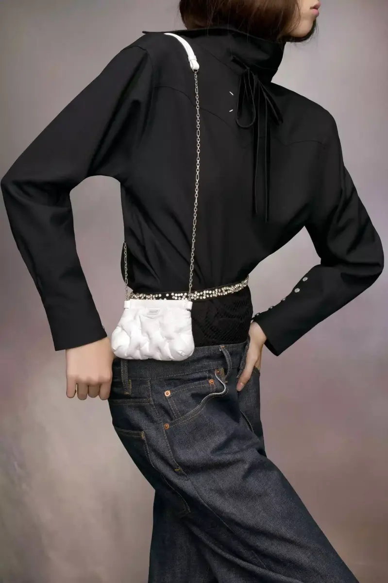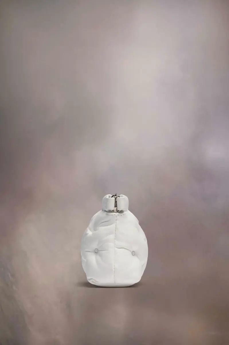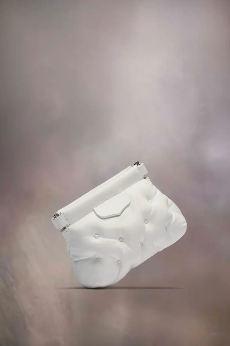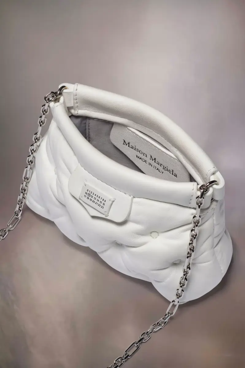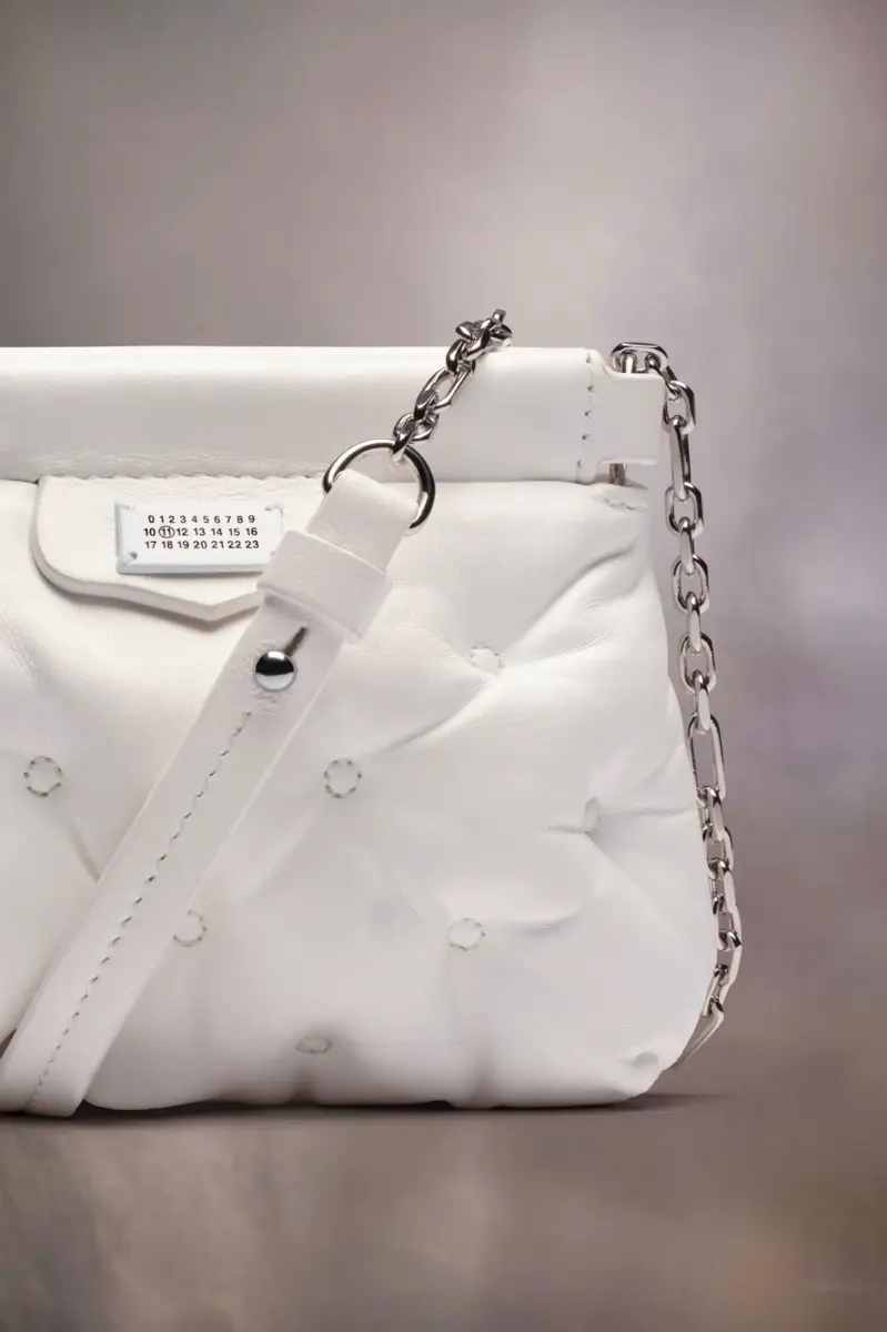 The Glam Slam classique baby is crafted from specially embroidered nappa leather. The Glam Slam debuted in the SS18 show and has a quilted design which mimics matelassé – the style of hand-stitched quilts created in Marseilles, France. The concept reflects the Maison’s notion of unconscious glamour and evokes its association to comfort, following the study into dressing and travelling rituals worldwide. This style features a chain strap for multi-wear, and is adorned with the numeric logo label at the front.