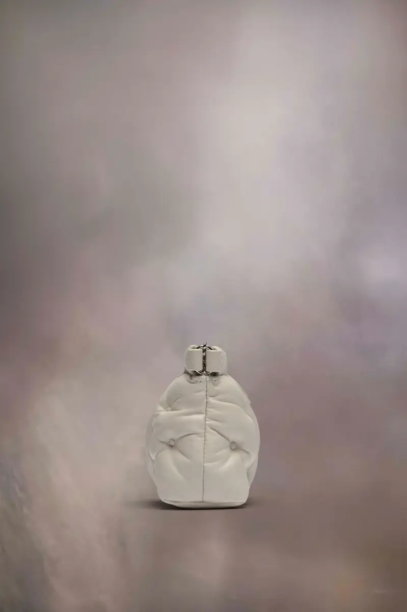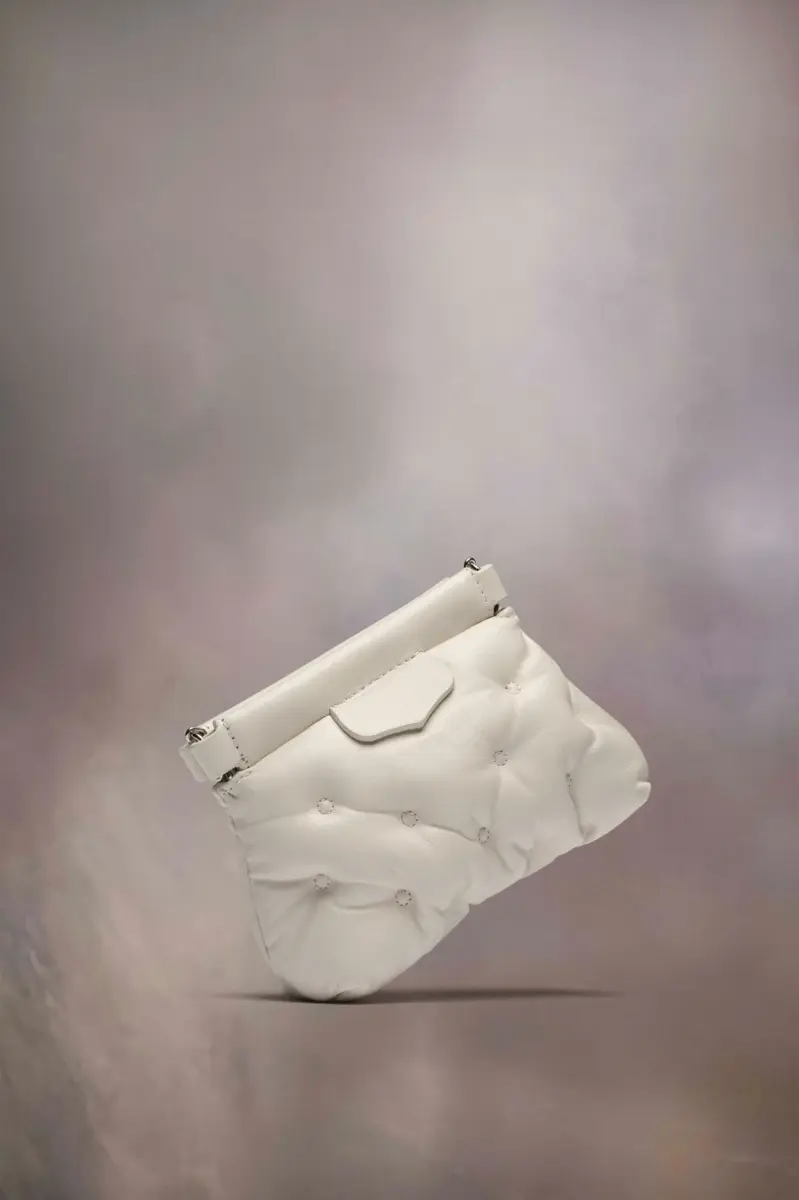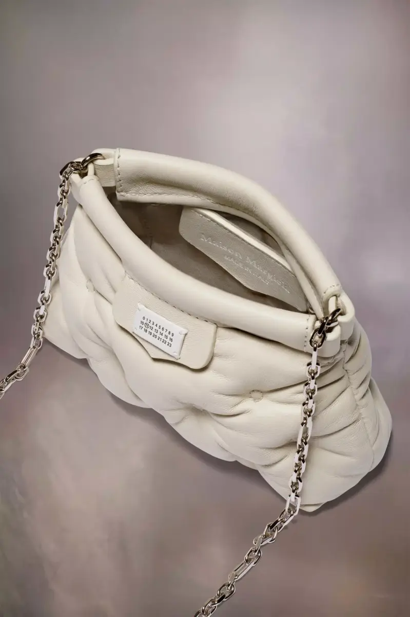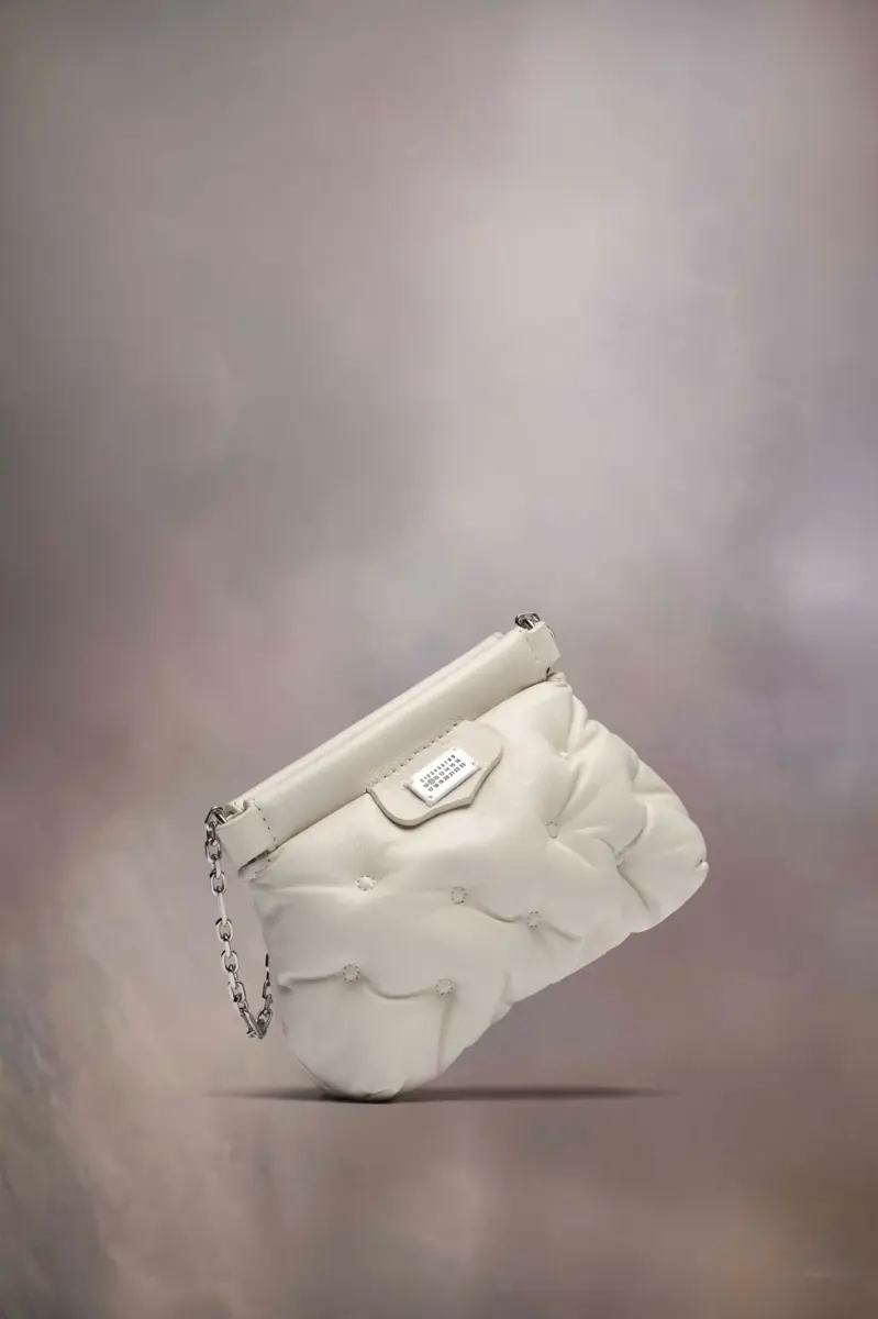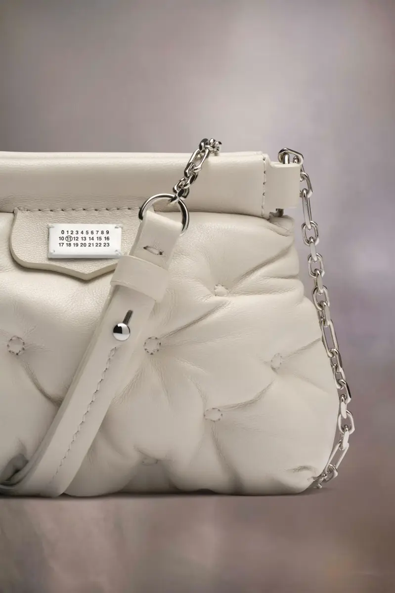 The Glam Slam classique baby is crafted from specially embroidered nappa leather. The Glam Slam debuted in the SS18 show and has a quilted design which mimics matelassé – the style of hand-stitched quilts created in Marseilles, France. The concept reflects the Maison’s notion of unconscious glamour and evokes its association to comfort, following the study into dressing and travelling rituals worldwide. This style features a chain strap for multi-wear, and is adorned with the numeric logo label at the front.