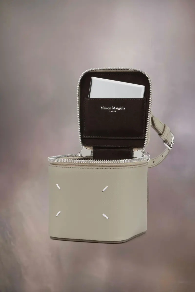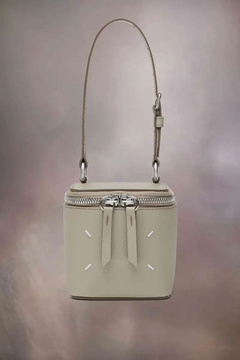 With an adjustable top handle, the mini box-shaped bag comes in calf leather with metallic hardware detailing. Maison Margiela’s signature Four stitches appear on the front; the opposite of a label.