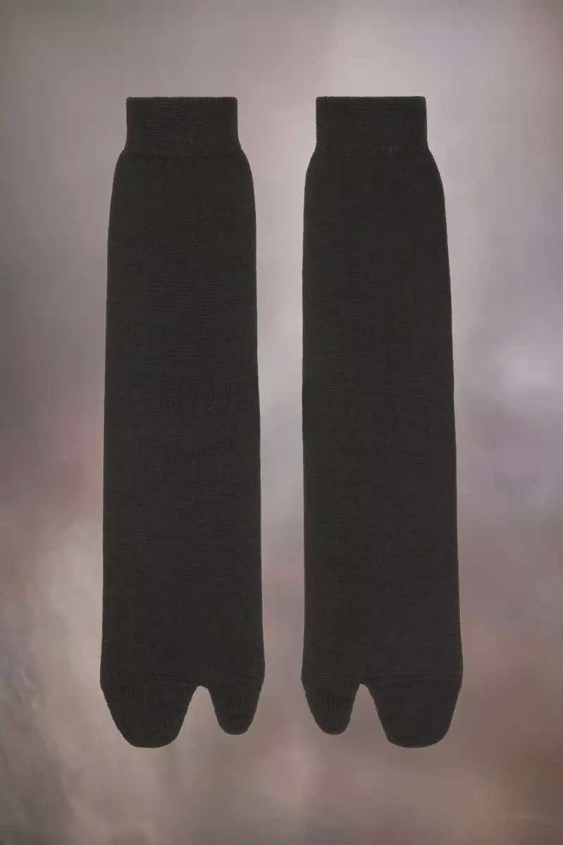 The jersey-cotton Tabi crew-length socks feature a single white stitch showing the hand of Maison Margiela. The Tabi split-toe is inspired by the traditional 15th century Japanese sock bearing the same name – launched for the Maison’s debut collection in 1989. It captures the avant-garde and insubordinate spirit of the Maison and exists as a heritage classic, continually explored through each collection. Gauge 18.