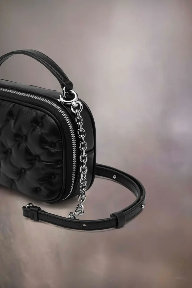 The mini Glam Slam camera belt bag is crafted from embroidered nappa leather. The Glam Slam debuted in the SS18 show and has a quilted design which mimics matelassé – the style of hand-stitched quilts created in Marseilles, France. The concept reflects the Maison’s notion of unconscious glamour and evokes its association to comfort, following the study into dressing and travelling rituals worldwide. This style features a top handle, belt strap, chain and is adorned with the numeric logo on the zip pull.