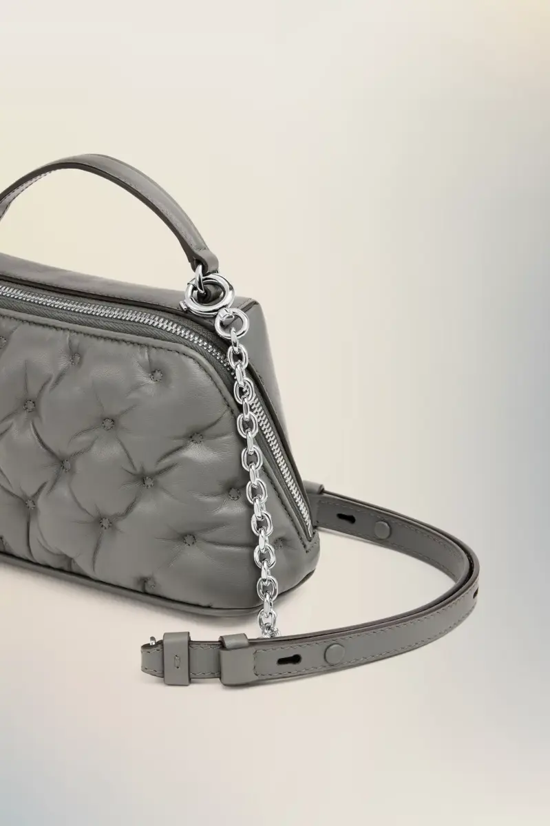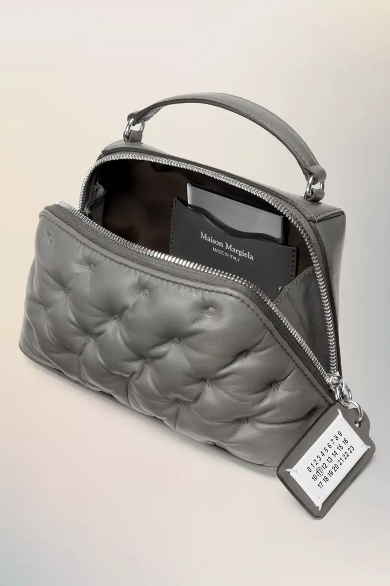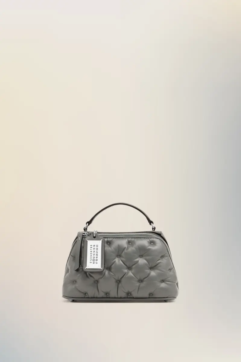 The Glam Slam trapezoid bag is crafted from embroidered nappa leather. The Glam Slam debuted in the SS18 show and has a quilted design which mimics matelassé – the style of hand-stitched quilts created in Marseilles, France. The concept reflects the Maison’s notion of unconscious glamour and evokes its association to comfort, following the study into dressing and travelling rituals worldwide. This style features a top handle, detachable chain shoulder strap, and is adorned with the numeric logo label on the zip pull.