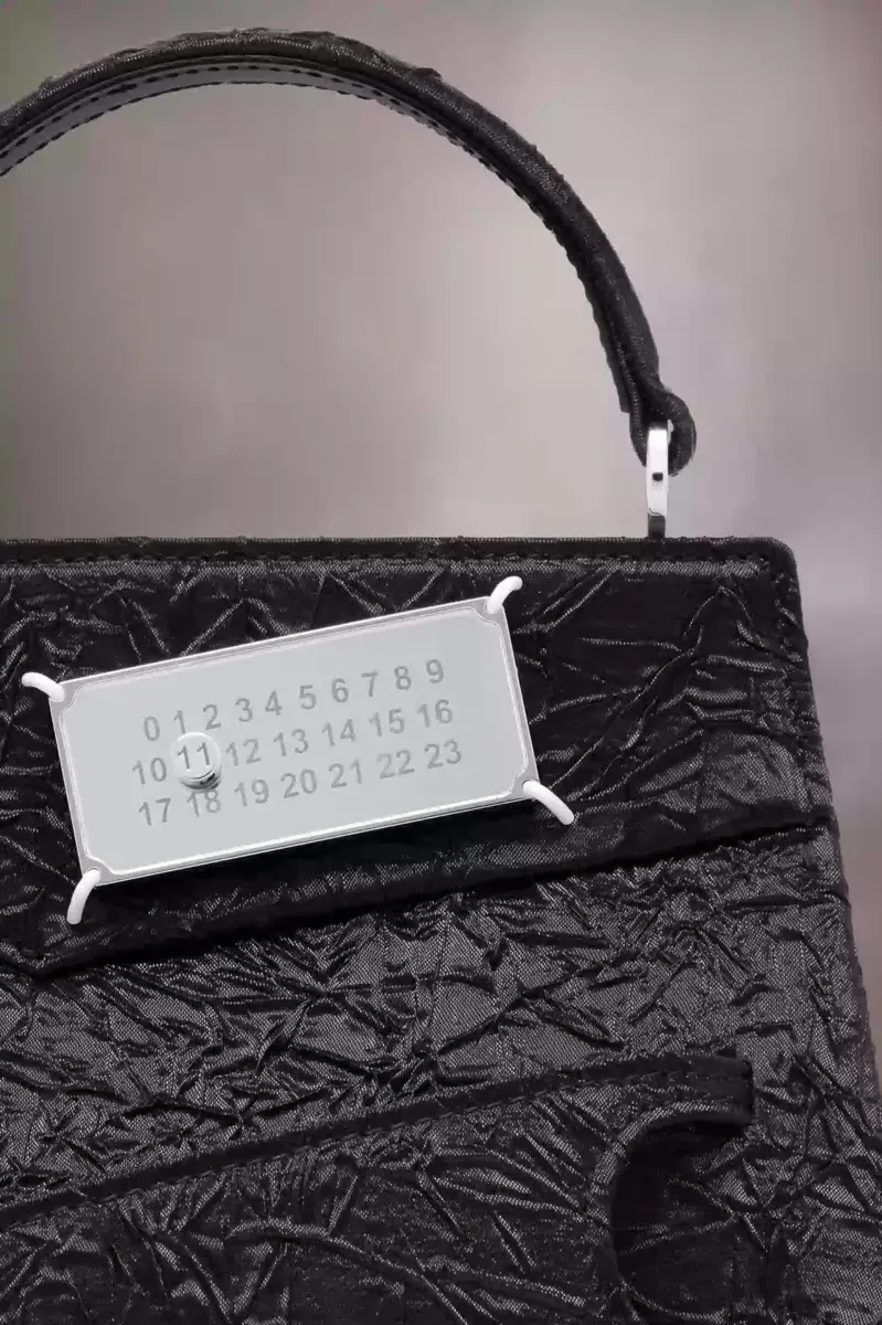 The Snatched handbag small is crafted from a textural fabrication, with a patent, metallized finish to emphasise the wrinkles. The Snatched debuted in the AW19 Artisanal Collection. It lends its name from the colloquial term for ‘good looks’, and also the way it can be held in a snatching manner. The genderless bag presents an asymmetric shape, inspired by origami. It features a leather shoulder strap, and a perforated front handle to be worn as a clutch. The bag introduces the Maison’s rectangular mirrored lock closure, adorned with the numeric logo that unlocks on number 11.