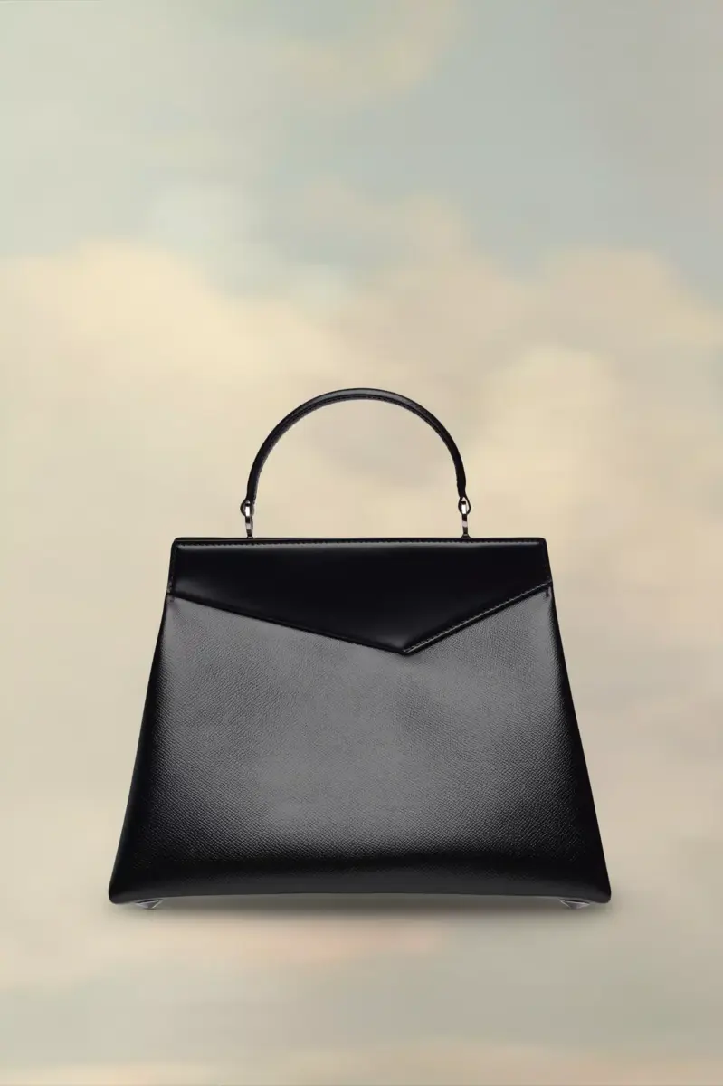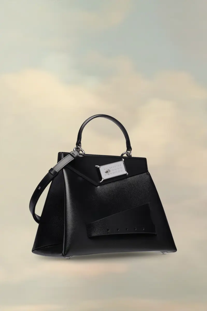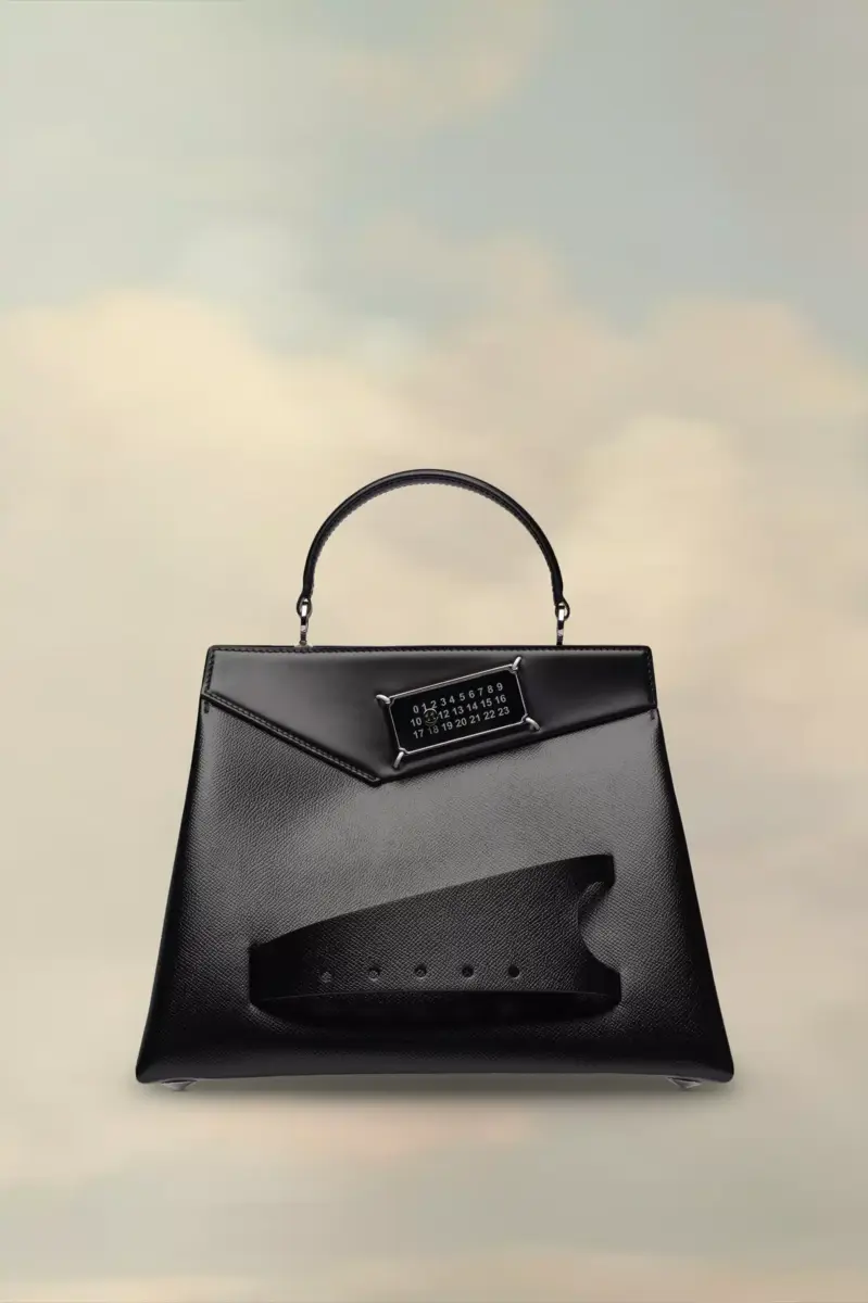 The Snatched handbag medium is crafted from grainy leather with contrasted smooth leather detail. The Snatched debuted in the AW19 Artisanal Collection. It lends its name from the colloquial term for ‘good looks’, and also the way it can be held in a snatching manner. The genderless bag presents an asymmetric shape, inspired by origami. It features a shoulder strap and a perforated front handle to be worn as a clutch. The bag introduces the Maison’s rectangular mirrored lock closure, adorned with the numeric logo that unlocks on number 11.