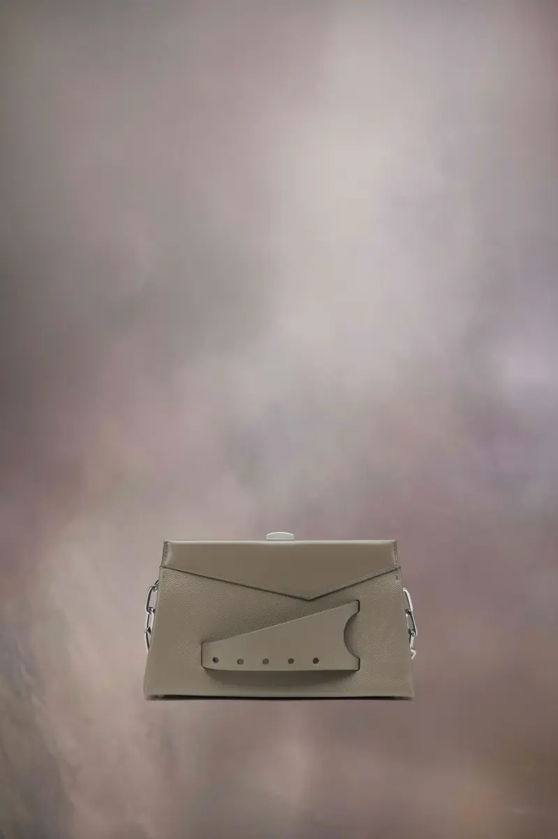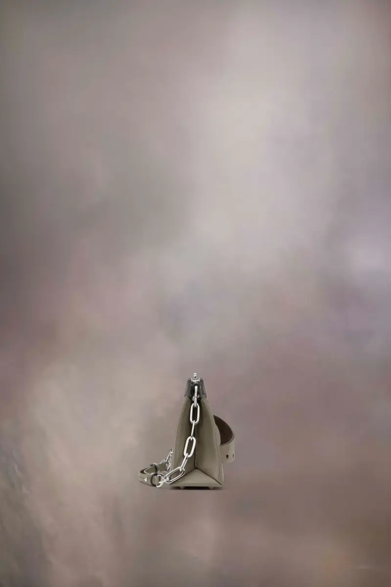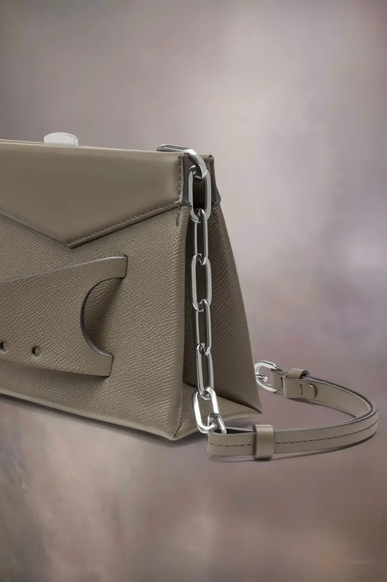 The small Snatched shoulder bag clutch is crafted from grainy leather. The Snatched debuted in the AW19 Artisanal Collection. It lends its name from the colloquial term for ‘good looks’, and also the way it can be held in a snatching manner. The genderless bag presents an asymmetric shape, inspired by origami. It features a chain strap, and a perforated front handle to be worn as a clutch.