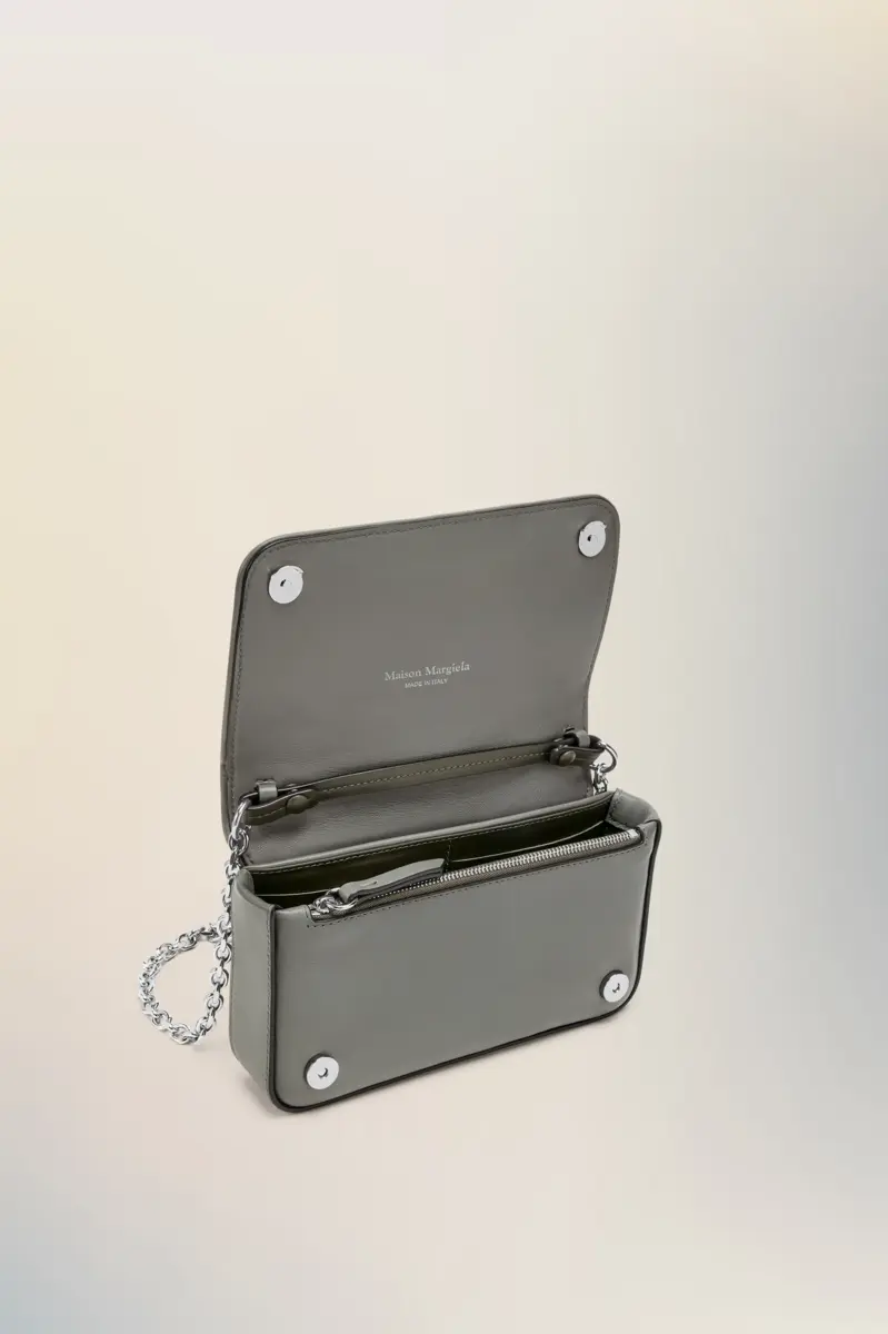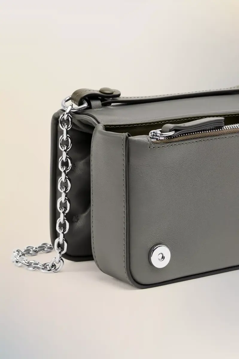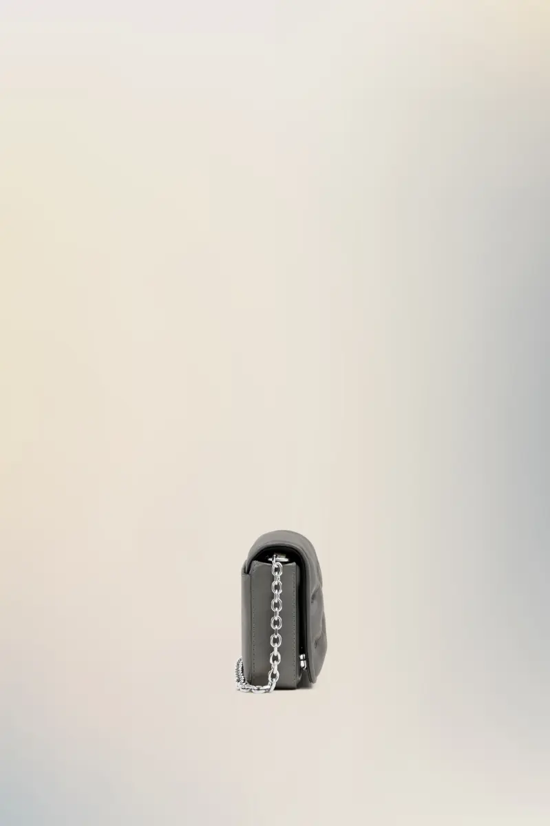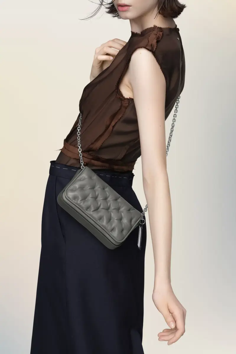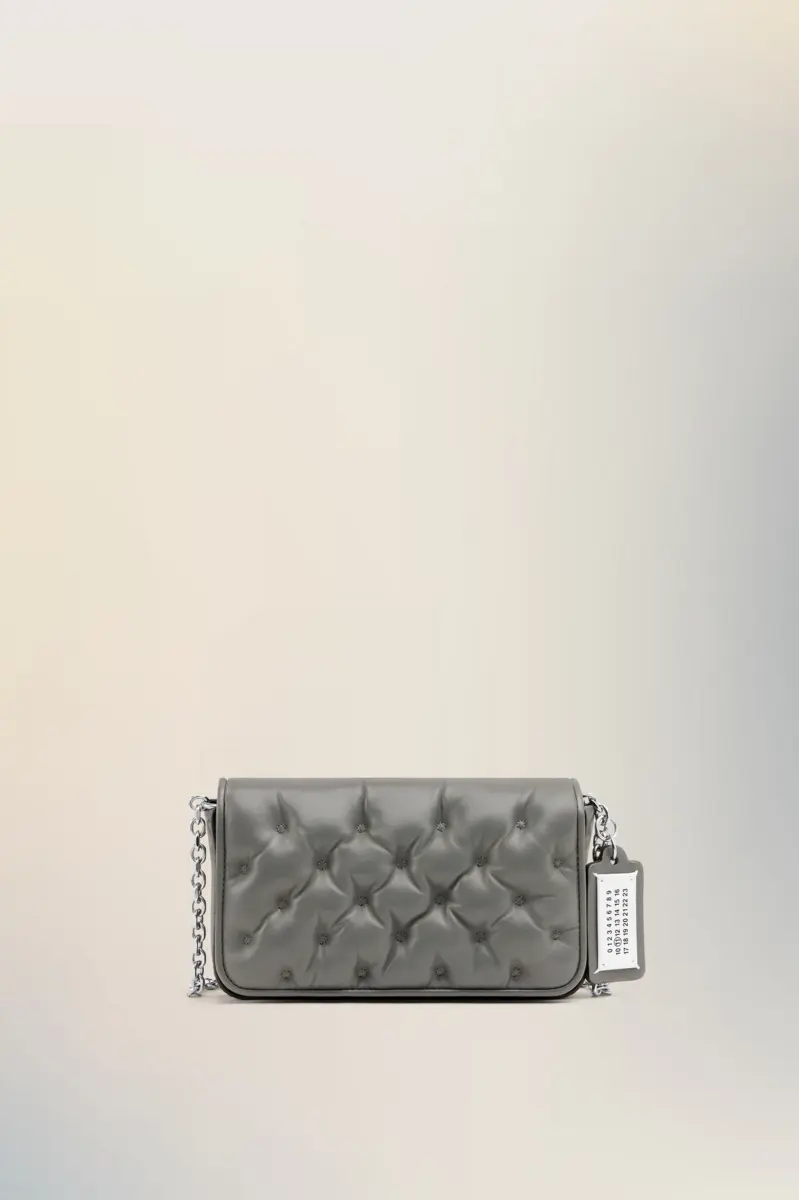 A compact evolution of the Glam Slam, this wallet bag channels the Maison’s idea of unconscious glamour through a quilted, pillow-soft exterior. Its structured form opens to multiple compartments, secured by magnetic fastenings and a polished zip. The chain strap and numeric logo tag add contrast — elegant, industrial, and unexpected.