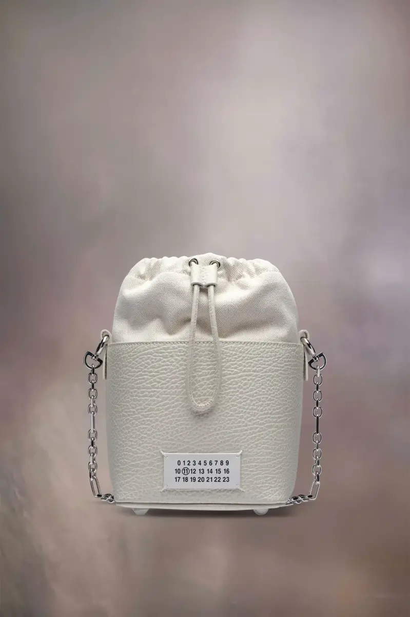 The 5AC bucket small, crafted from grainy leather, features a top handle and a chain shoulder strap. It is accented with the logo label at the front. The iconic 5AC line takes its name from the French word ‘sac’ (bag). It explores the Maison’s Anonymity of the lining concept. The bag’s metal rivets are covered in leather by hand, with the metal visible only where needed, for a clean aspect. Artisanal details include the bag’s exposed edges hand-painted in tone with the leather.