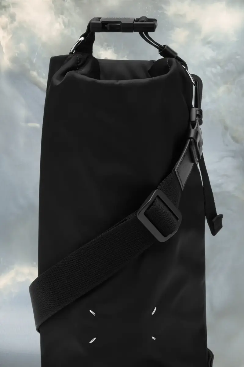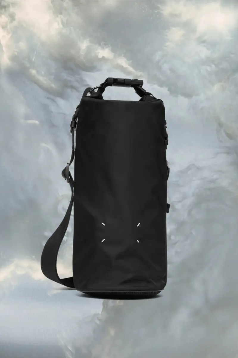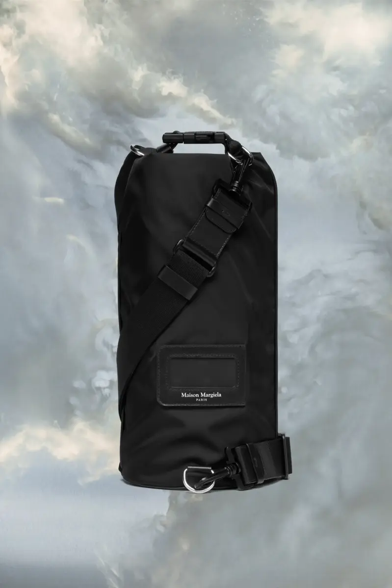 Inspired by outdoor wear, the roll-up bag comes in nylon with a detachable, adjustable strap and a buckle, which is accented with the Maison Margiela numerical logo. A clear slot appears at the front with the logo. Maison Margiela’s signature, the Four stitches, appear at the back; the opposite of a label.