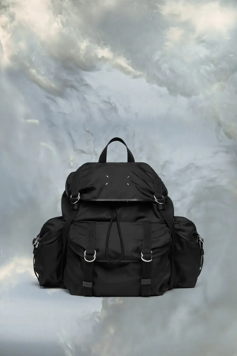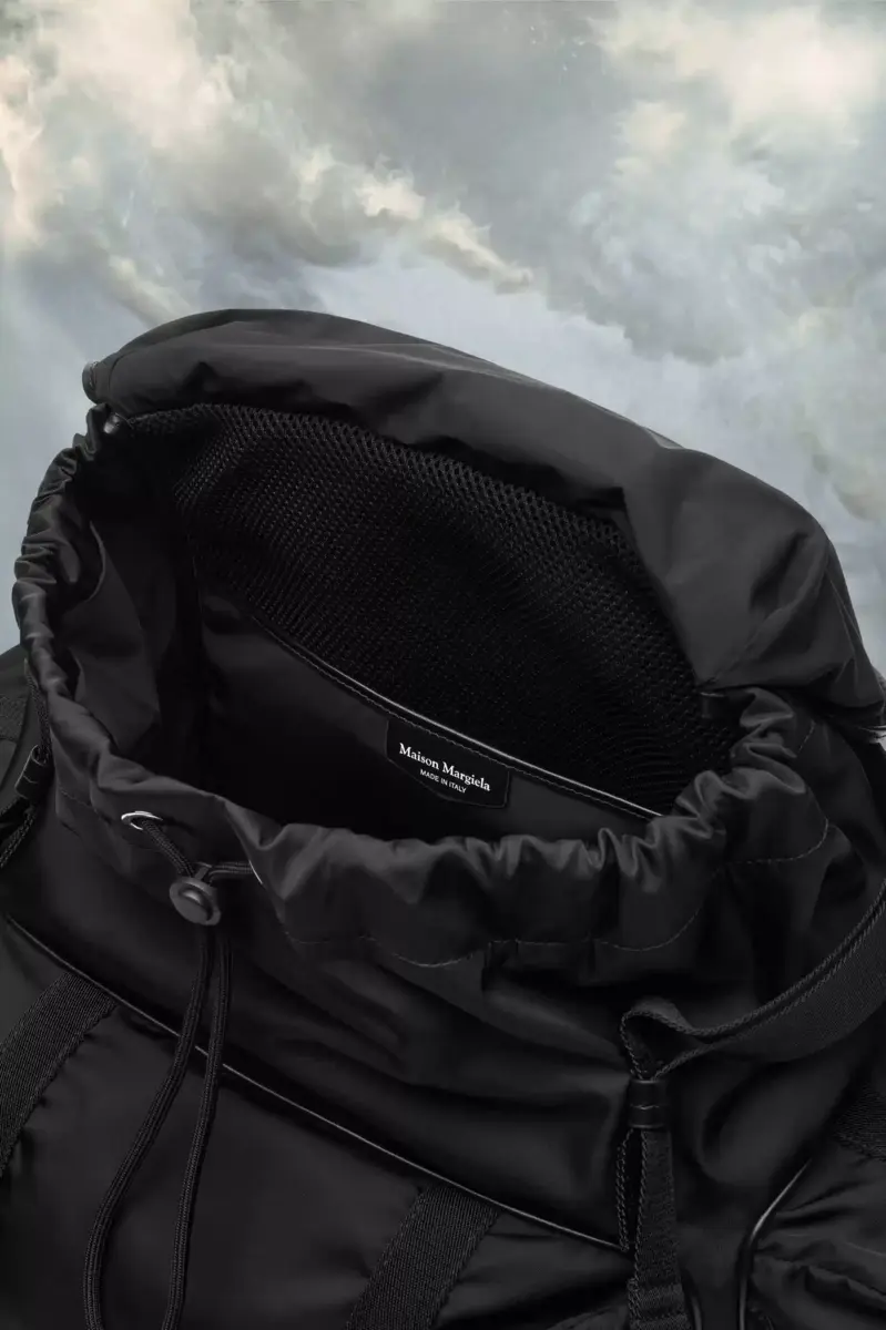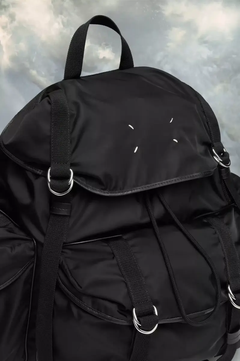 The XL backpack is a utilitarian design made in nylon with calf leather contrast. It features a drawstring, top handle and anatomic mesh shoulder straps and is designed with large pockets, secured by D-rings and trailing ties. A clear slot appears on the back with the logo. Maison Margiela’s signature, the Four stitches, appear on the flap; the opposite of a label.
