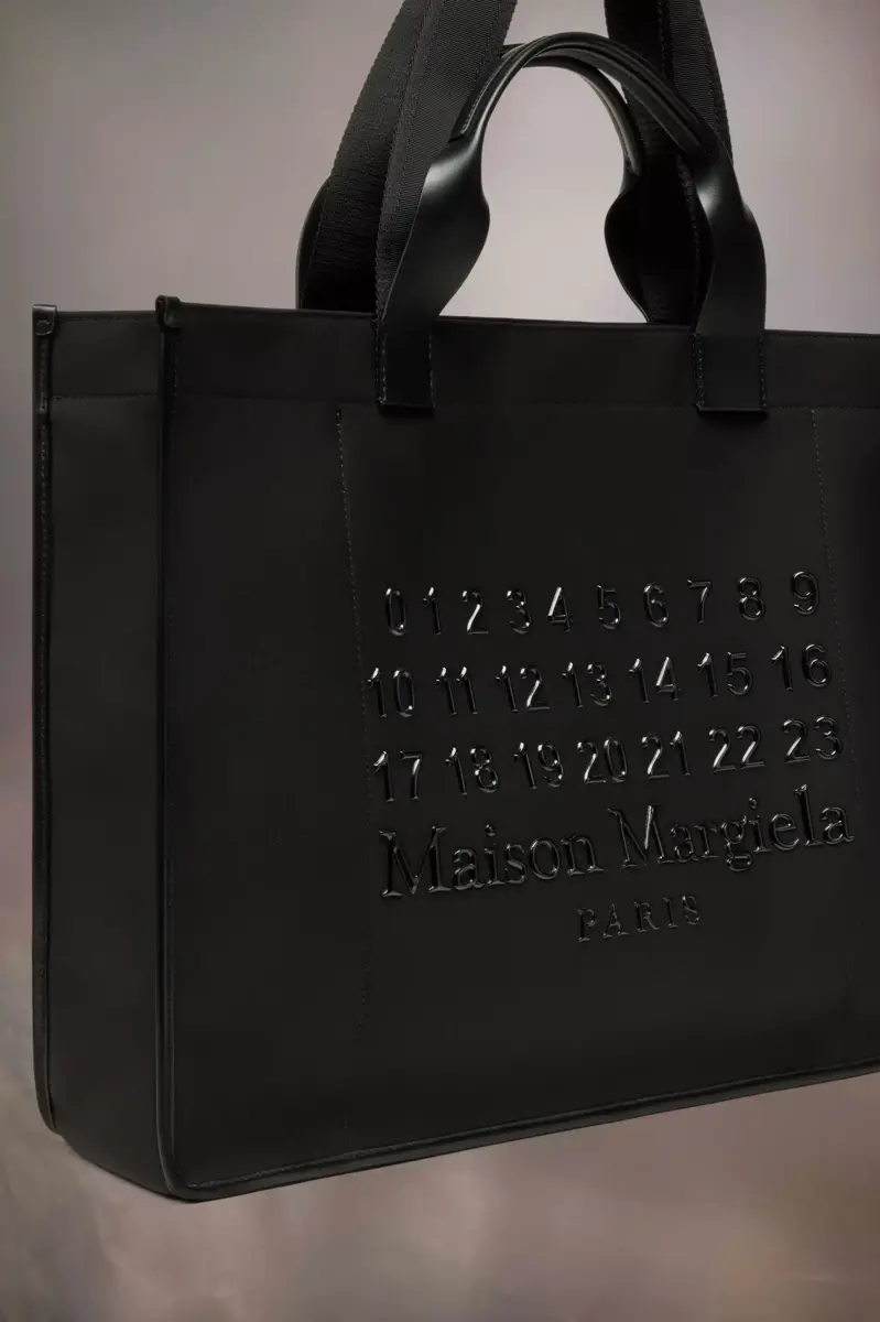 In Mackintosh fabric with patent calf leather contrast, the large Cabas shopping bag is complete with long and short top handles plus inner pockets. It is adorned with the Maison Margiela numeric logo across the front.