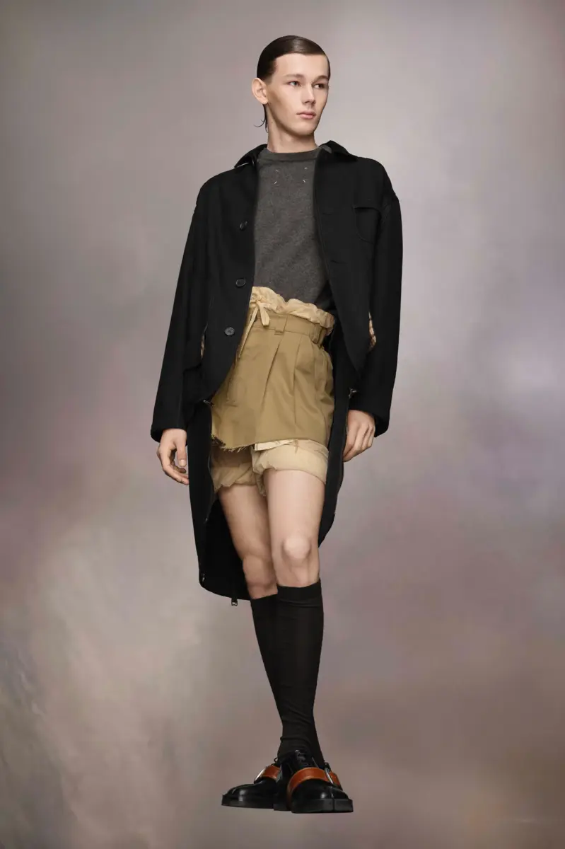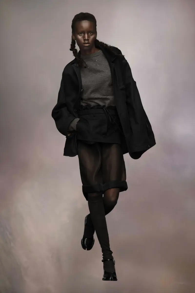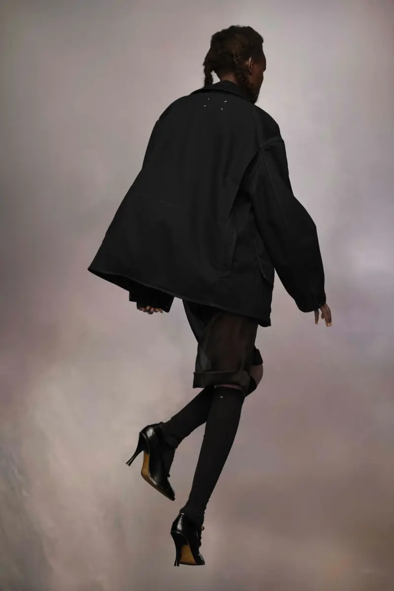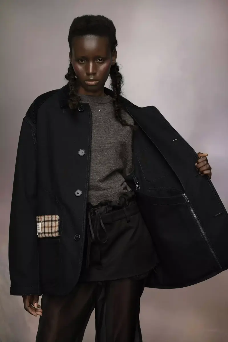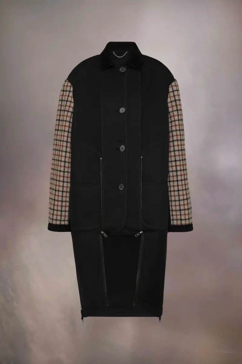 Crafted from heavy cotton with wool sleeves, the coat can be worn in its knee-length design with contrast panel or worn in a jacket silhouette by folding with zips. It has a chest pocket and flap pockets as well as a collar and button fastenings. Maison Margiela’s signature, the Four stitches, appear at the back; the opposite of a label.